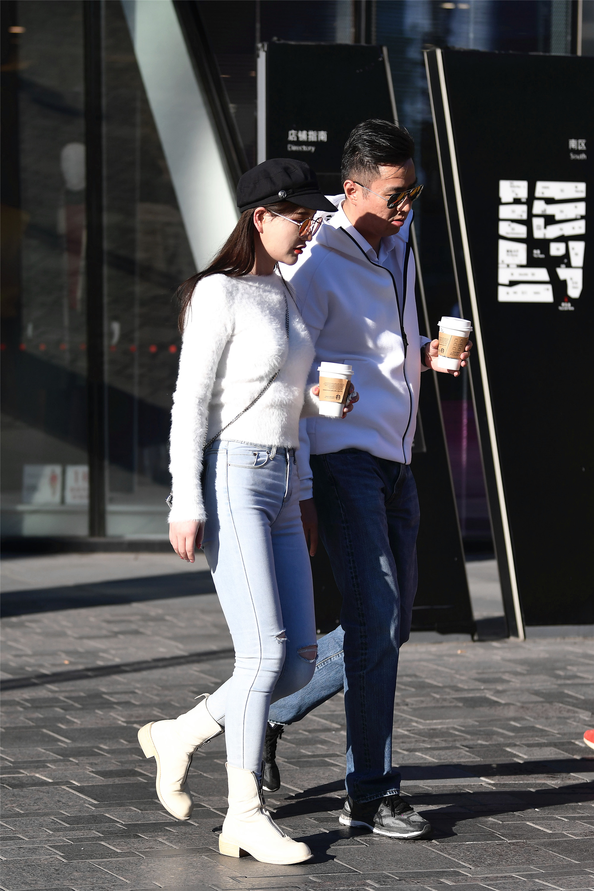 当然有人喜欢亮色搭配,一身偏白的色彩,也是很出彩的,白色毛衣刚好到牛仔裤的边缘,长袖的款式有很保暖,一双白色的短靴,和牛仔裤很好的结合,让你看到她有着很好的身材比例。