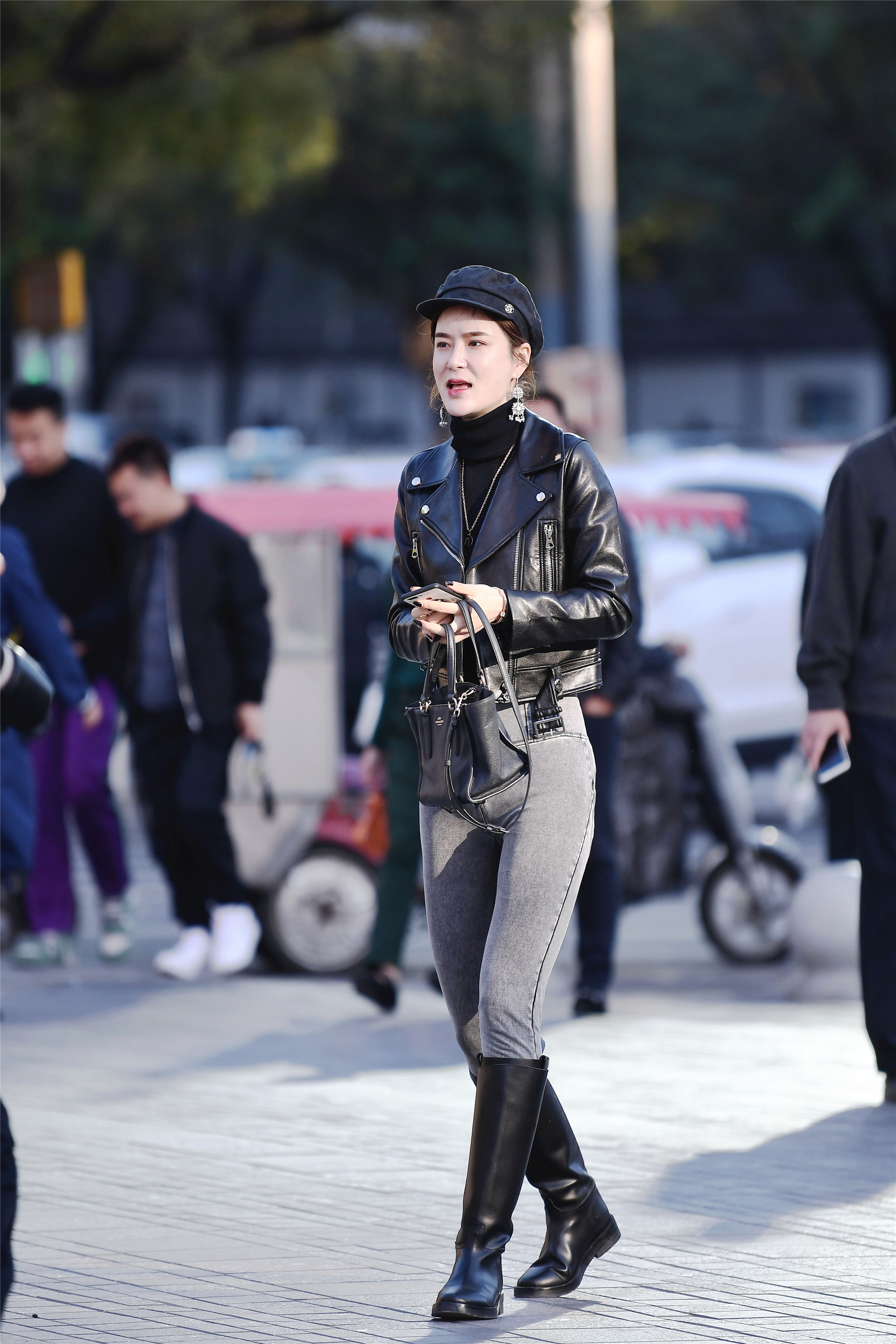 浅灰色牛仔裤,搭配一双黑色高筒靴,在黑色皮夹克的映衬下,显的腿很长,身材比例也很好,而且搭配出来的效果也显得干净利落,也可以让你感受到小姐姐那种干脆果决的性格。