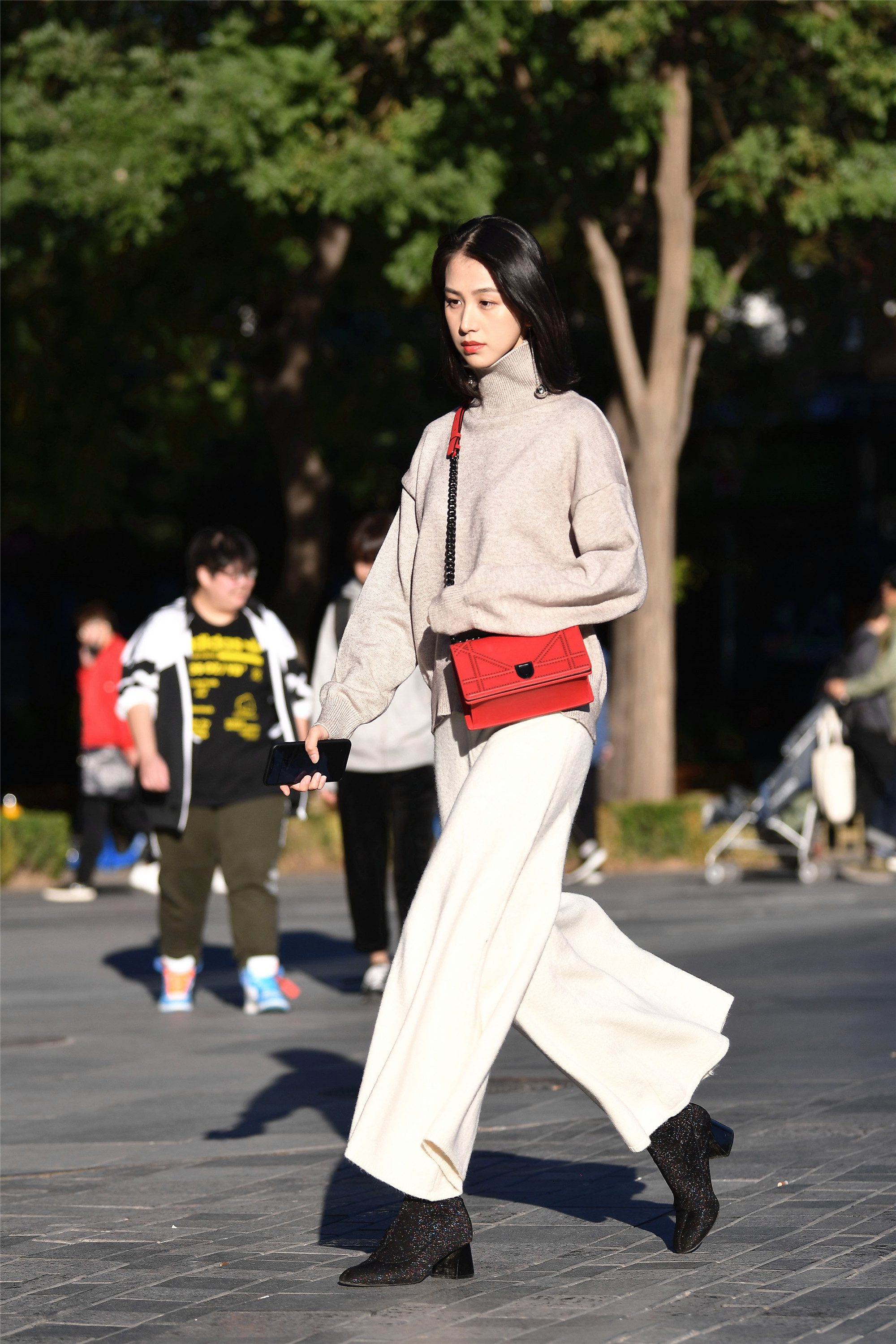 米灰色的高领针织毛衣,显得很保暖,白色的阔腿裤走路会带着优雅的气质,而且那一步迈出,恰到好处,让你看到她真的有长腿,一双短靴,简单宽松的搭配,让你感觉这就是秋天的味道。