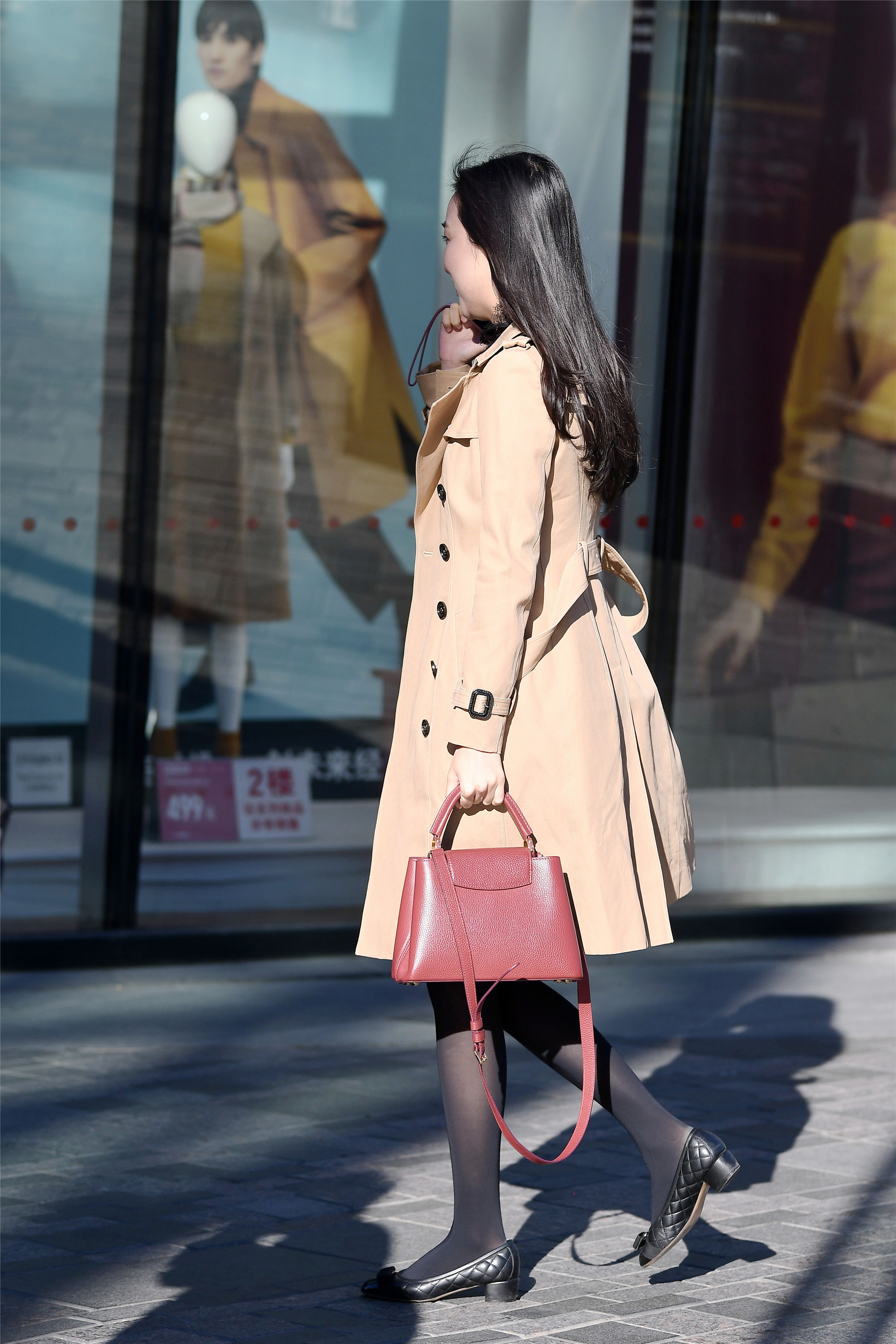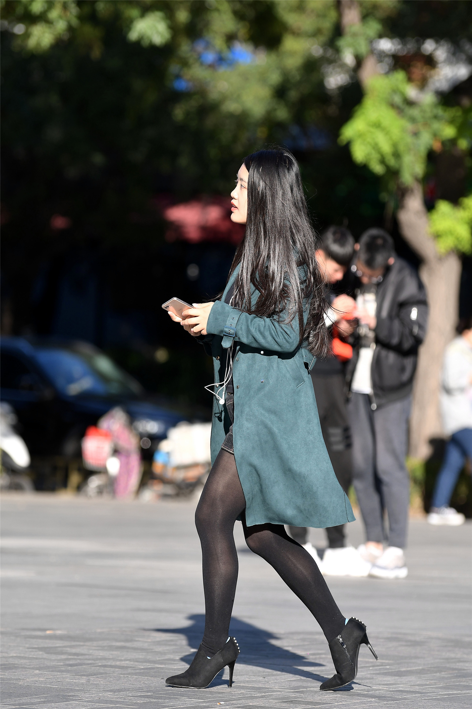 这位姐姐很喜欢黑色搭配,黑色尖头细跟鞋搭配黑色丝袜,搭配在一起非常时尚漂亮,黑色风衣也是很典型的秋装搭配,虽然姐姐的个子不高,但是这样的搭配很显气质。
