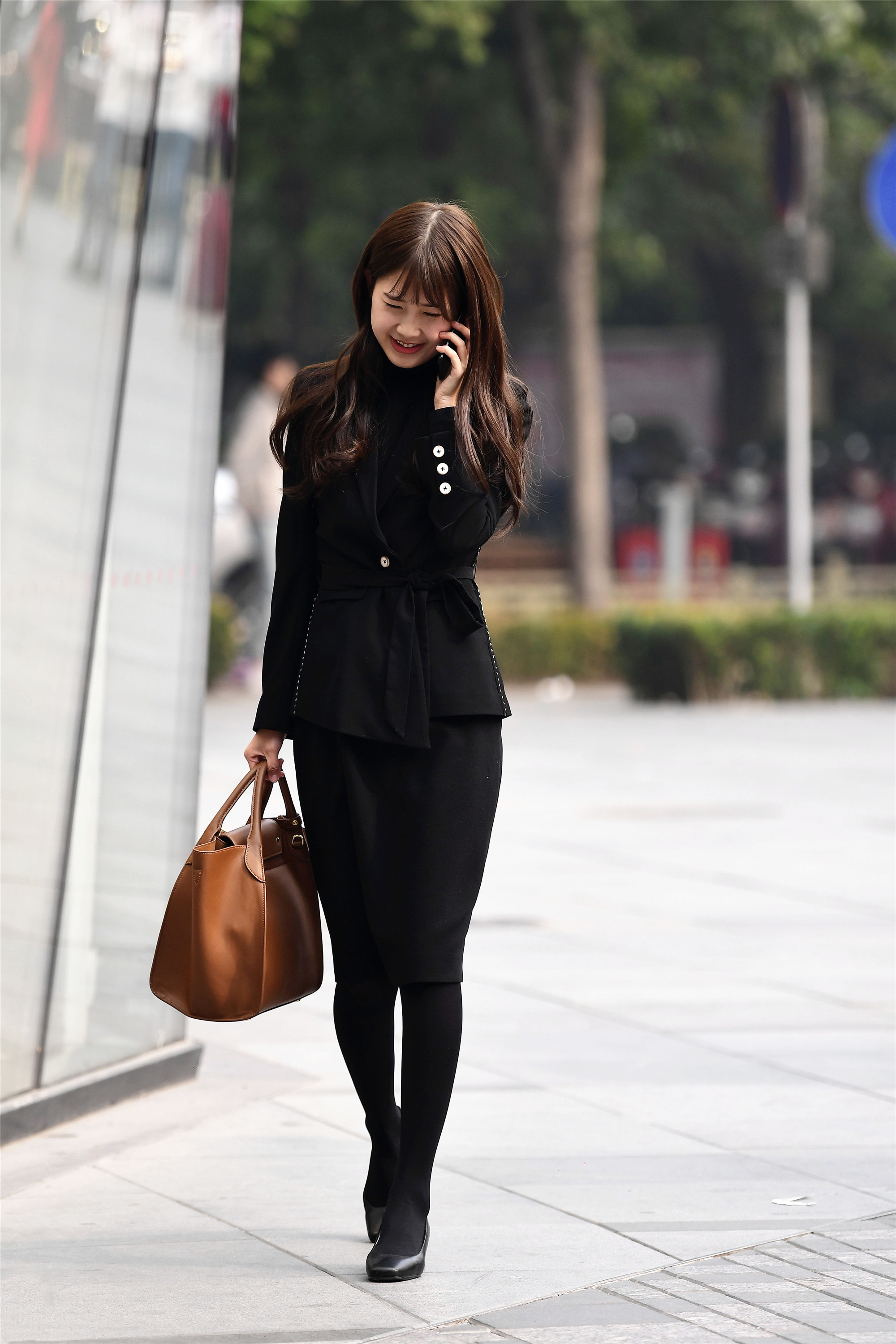 到了深秋时节,也有人开始搭配黑色出门,这一位姐姐她一身黑色,黑色西装和黑色筒裙搭配出职场丽人风范,黑丝袜搭配一双黑色皮鞋,整体的黑色,却又带着OL风格搭配。