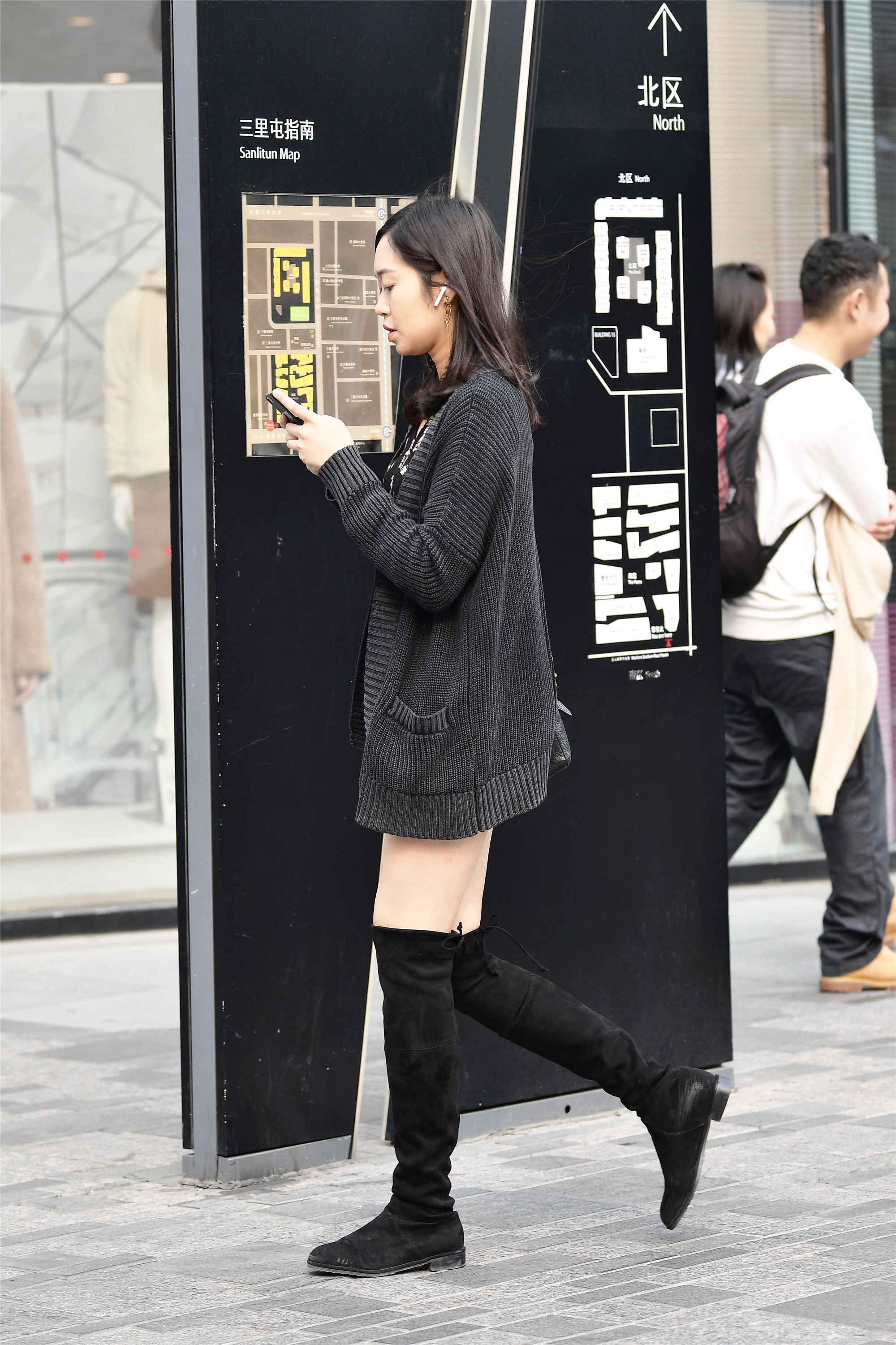 喜欢个性,是现在大城市里很多人的想法,就要搭配的和别人不一样,即使是一身黑色,也可以搭配出自己的个性来,黑色的长袖针织敞怀外套,搭配一双绒面过膝靴,就是这样的简单,但是不是谁都可以模仿的来的,这样搭配要看身材,腿纤细修长,这样穿着高筒靴才会有美感。