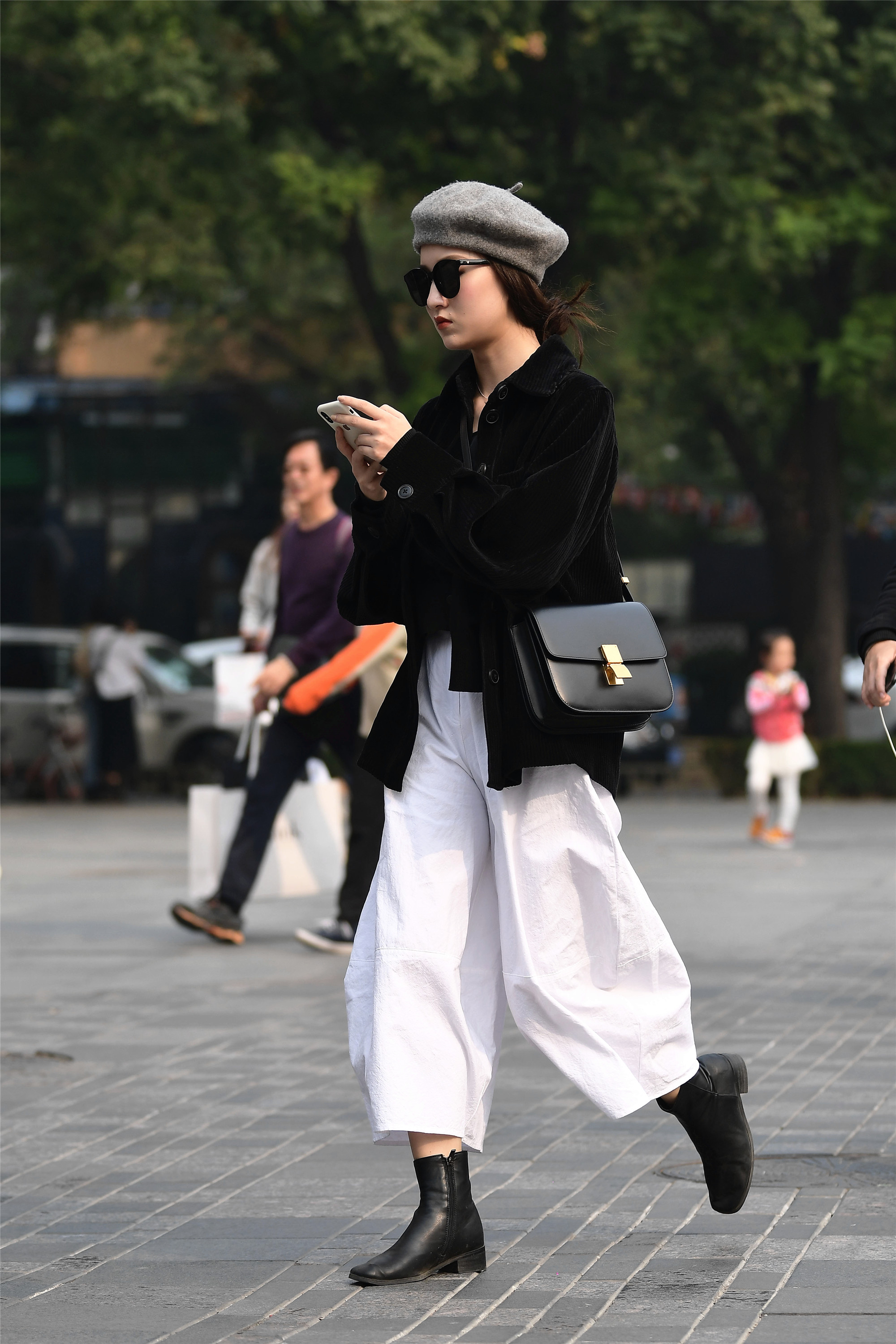 小姐姐身上三色,黑白灰,但是整体以黑白色对比为主,灰色的南瓜帽作为点缀,黑色细条绒外套,错襟的设计,非常有层次感,敞怀穿搭,会让你看到内搭效果,白色的阔腿裤,九分长度,敞怀上衣可以看到阔腿裤的高腰,这样搭配的很显身材,一双平底短靴,秀出一段脚脖让小姐姐身材很显瘦的效果。