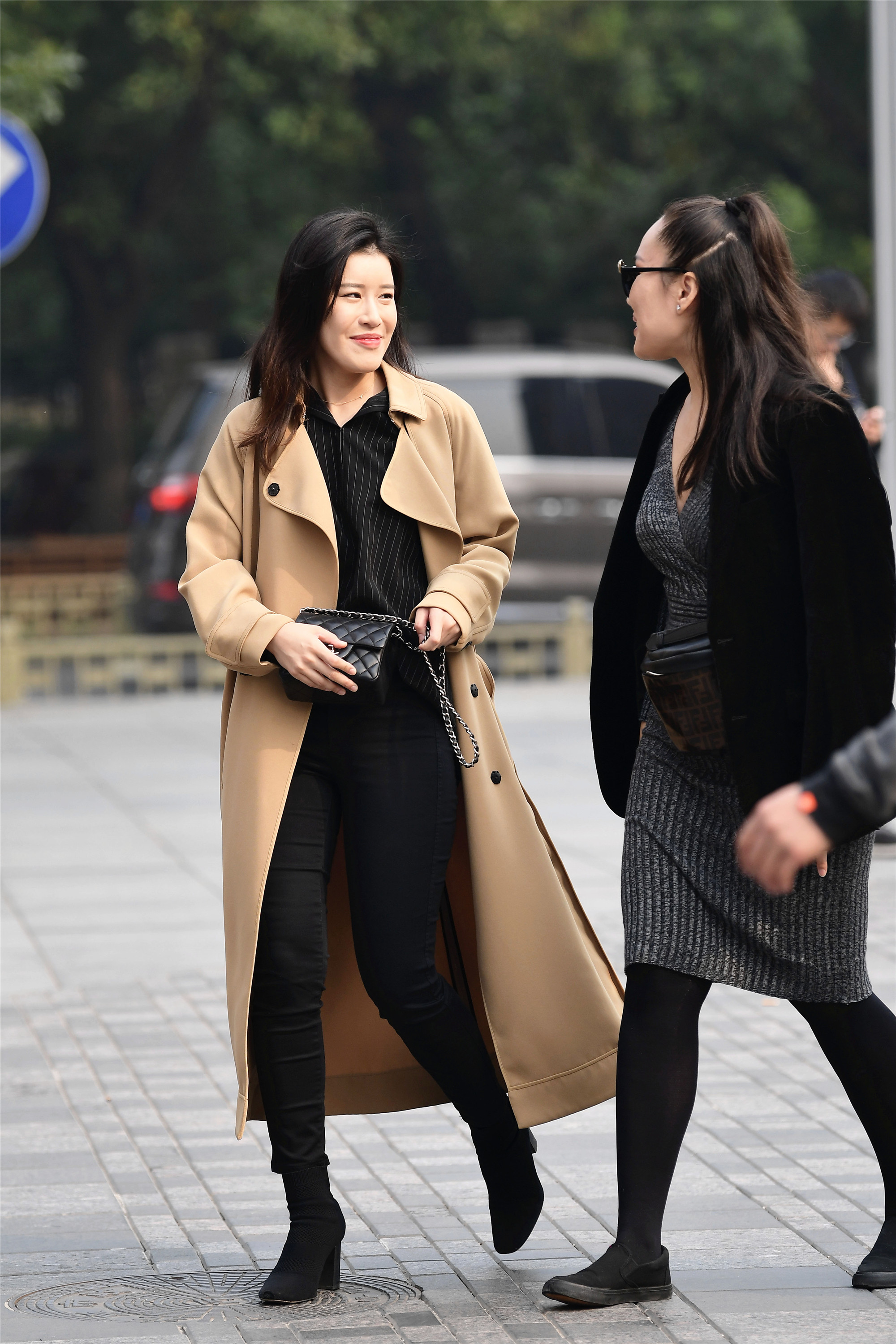 大了秋天,风衣是必不可少的一环,当然,风衣要想搭配的漂亮,一定要敞怀,这样才有风度的感觉,女士要是把扣子系上,就会显得很呆板的感觉,而这位姐姐穿着米色风衣和一身黑色内搭,有着一些内秀的感觉。