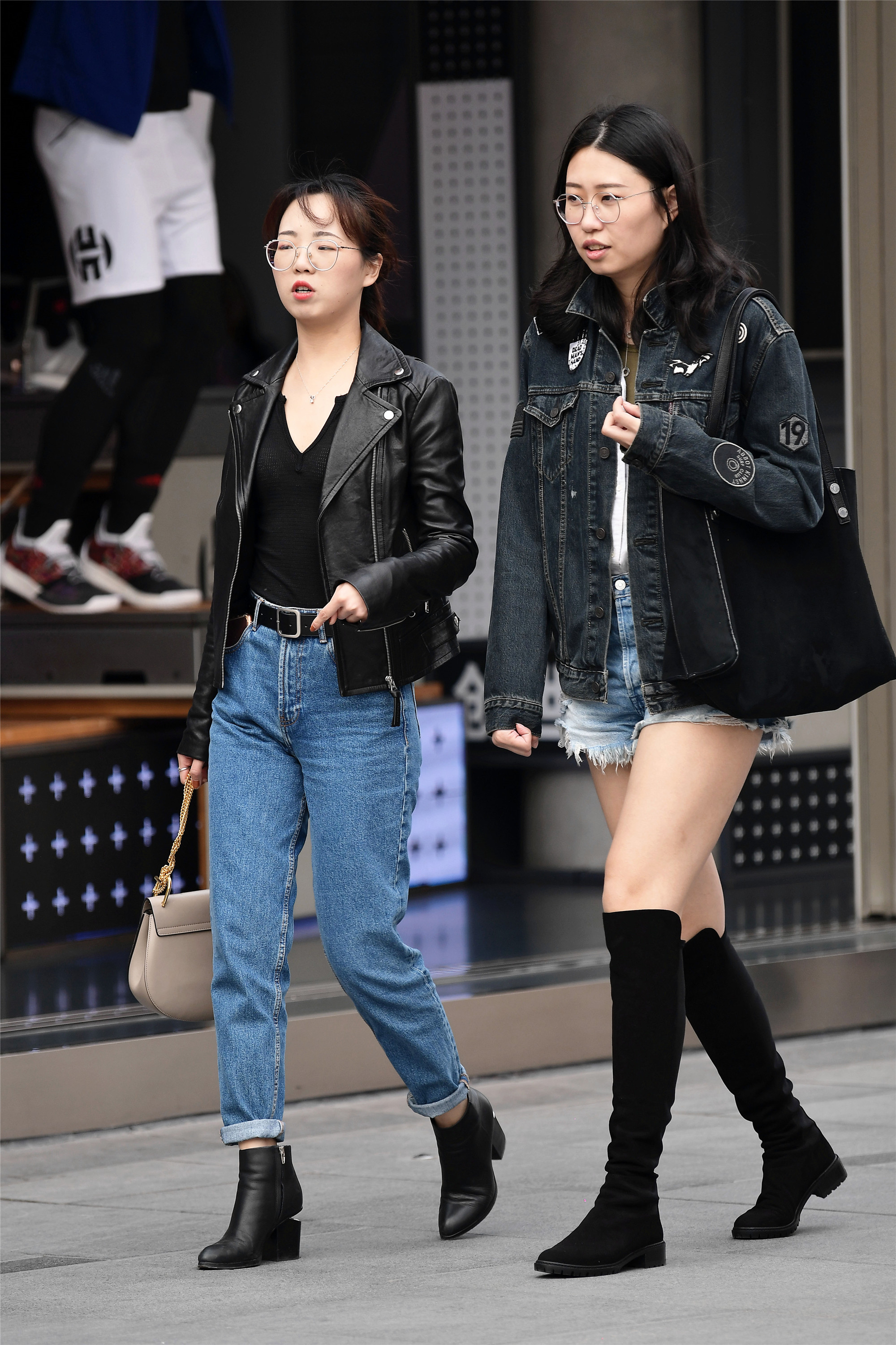 和闺蜜逛街,也是一种享受,也不需要搭配的一样,但是都会搭配出自己的风格,秋天穿着牛仔裤搭配皮夹克,这是几年来都很流行的春秋搭配,她的闺蜜却是牛仔短裤搭配着高筒靴,这也是很经典的搭配,还有一件牛仔服,如果是那种小牛仔长袖的,效果会更好。