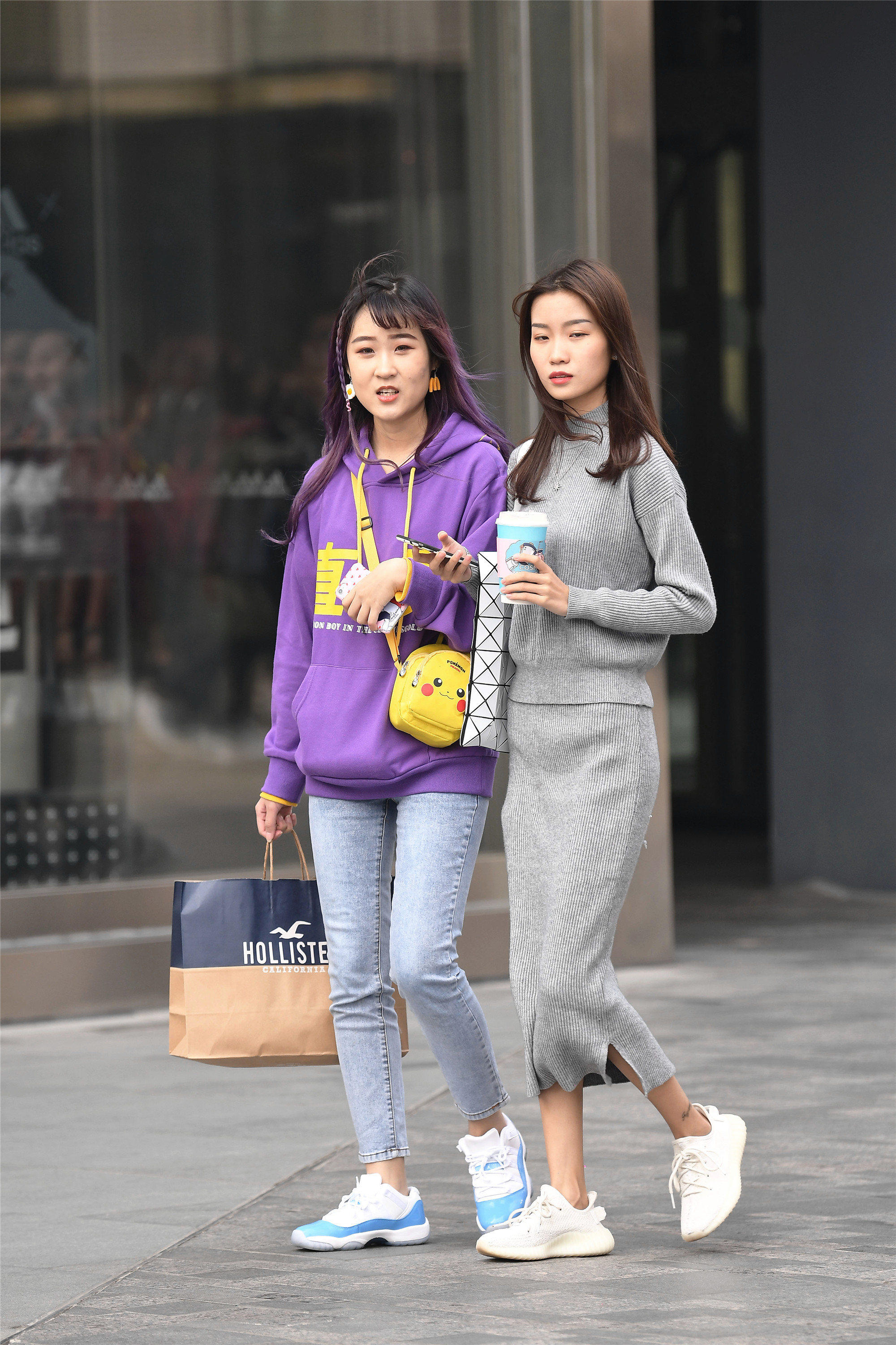 在秋天,也可以把色彩搭配的亮一点,紫色虽然也算是冷色系,但是秋天穿也是很不错的,而且秋天穿着紫色的卫衣,也是很合适的,牛仔裤和运动鞋,非常有个性,她的姐妹是灰色的针织套装,长裙的效果非常好,而且很能显身材。