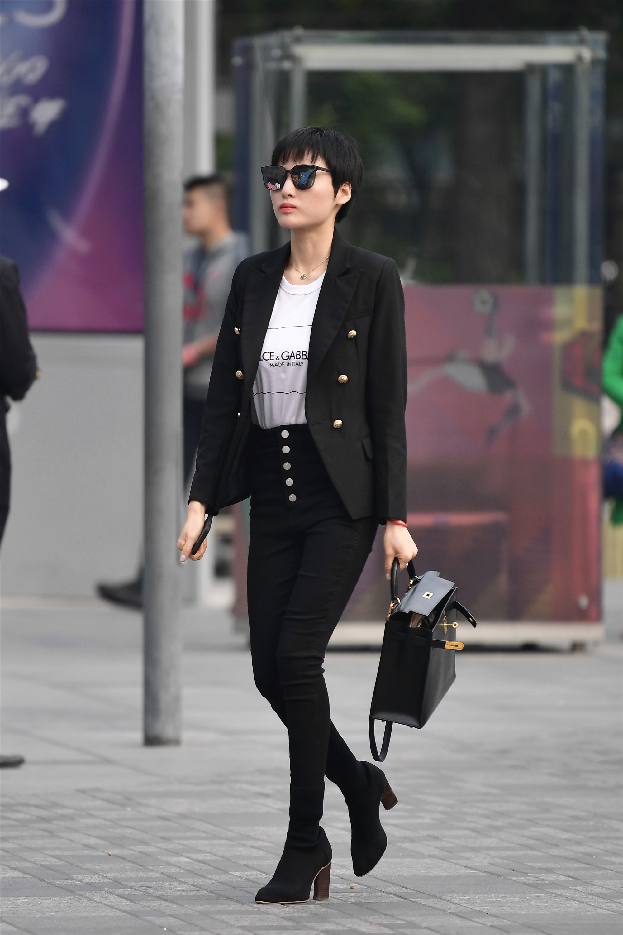黑色西装搭配白色圆领小衫,黑色高腰铅笔裤,让她纤细的双腿凸显出来,搭配一双短袜靴,这样搭配感觉果敢,干练的味道,而且她一头短发,更是显得精简干练。
