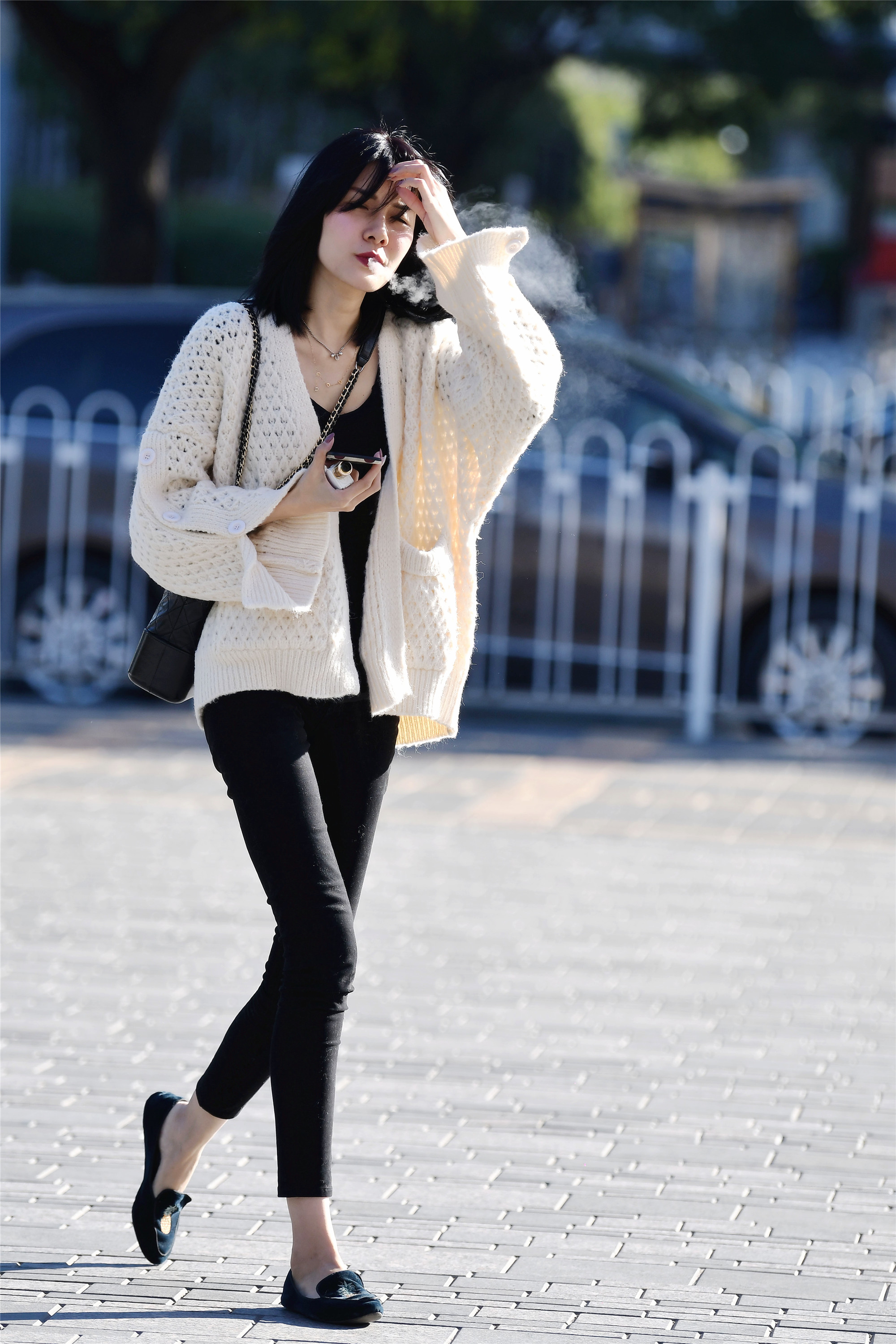 白色针织外套镂空的款式,保暖性不是特别好,但是层次感十足,带着个性味道,黑色打底裤,九分长度恰好让她秀出自己的脚踝,一双平底的休闲鞋子,这样优雅的走在街头,让你看到秋装搭配。