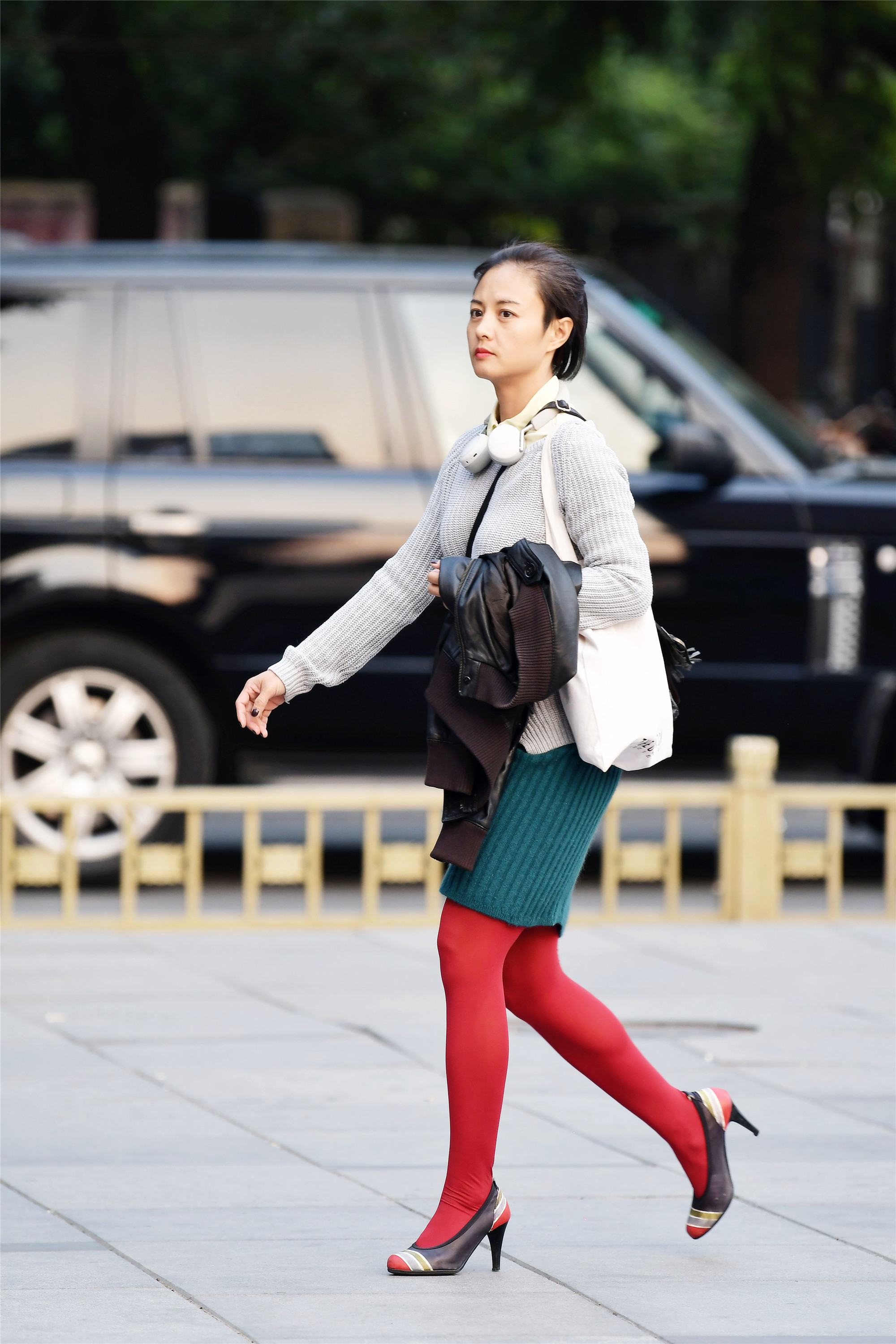 很少有人搭配红和绿,因为非常难搭配,但是也有很多人来挑战,今天这位姐姐她穿着红色的打底裤搭配一条绿色的针织筒裙,一双圆头的高跟凉鞋,更是个性的搭配,一件灰色针织毛衣,臂弯里搭着一件外套,针织带来的蓬松感,和深秋的味道,让你感觉这个秋天很不错。
