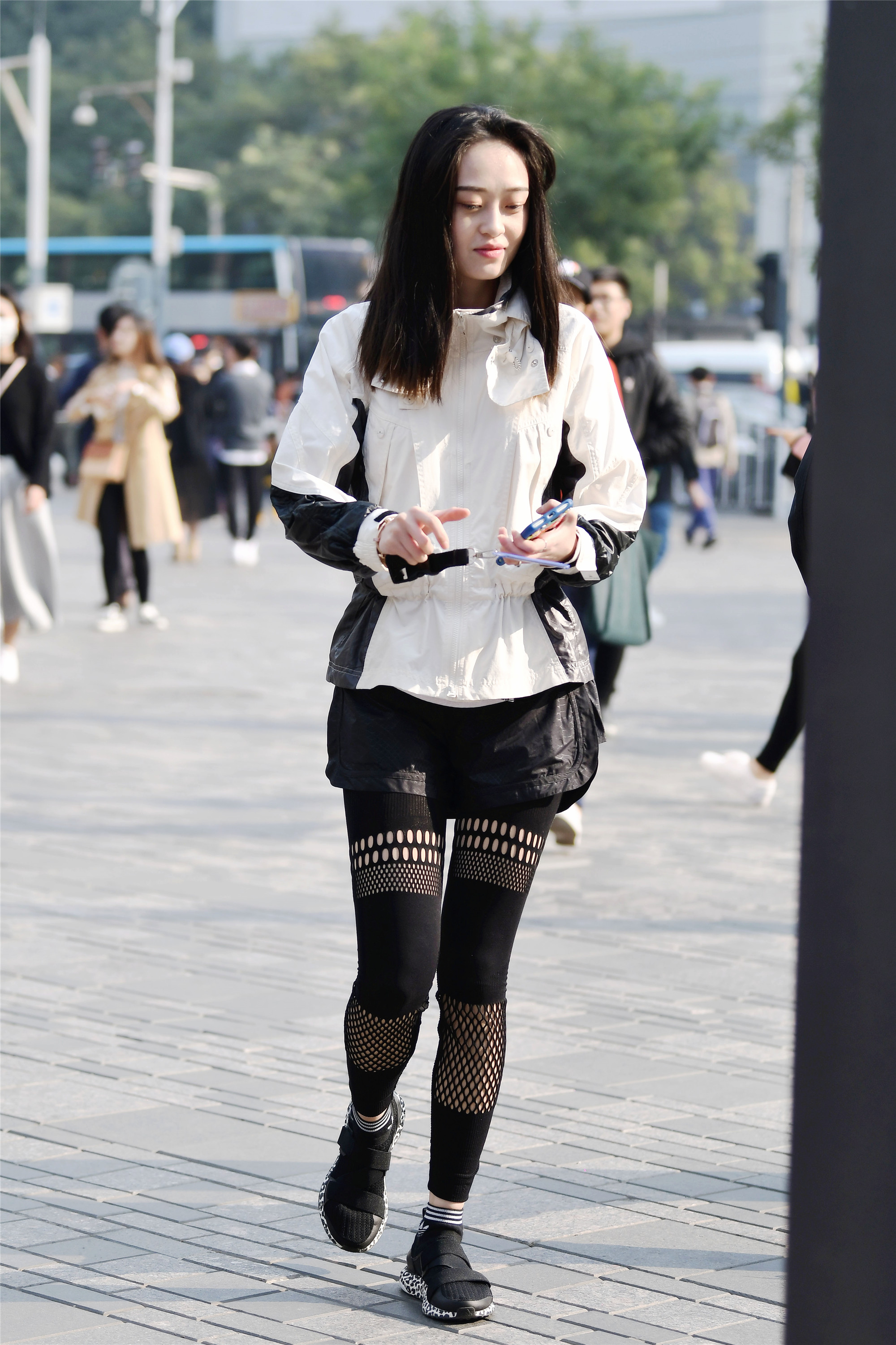 黑色镂空打底裤,搭配一双平底鞋,走路逛街方便自然,一条黑色短裤,是和打底裤的经典搭配之一,黑白拼接的外套,姑娘将上身包裹的严严实实的,上身穿的严实就全身不冷了。
