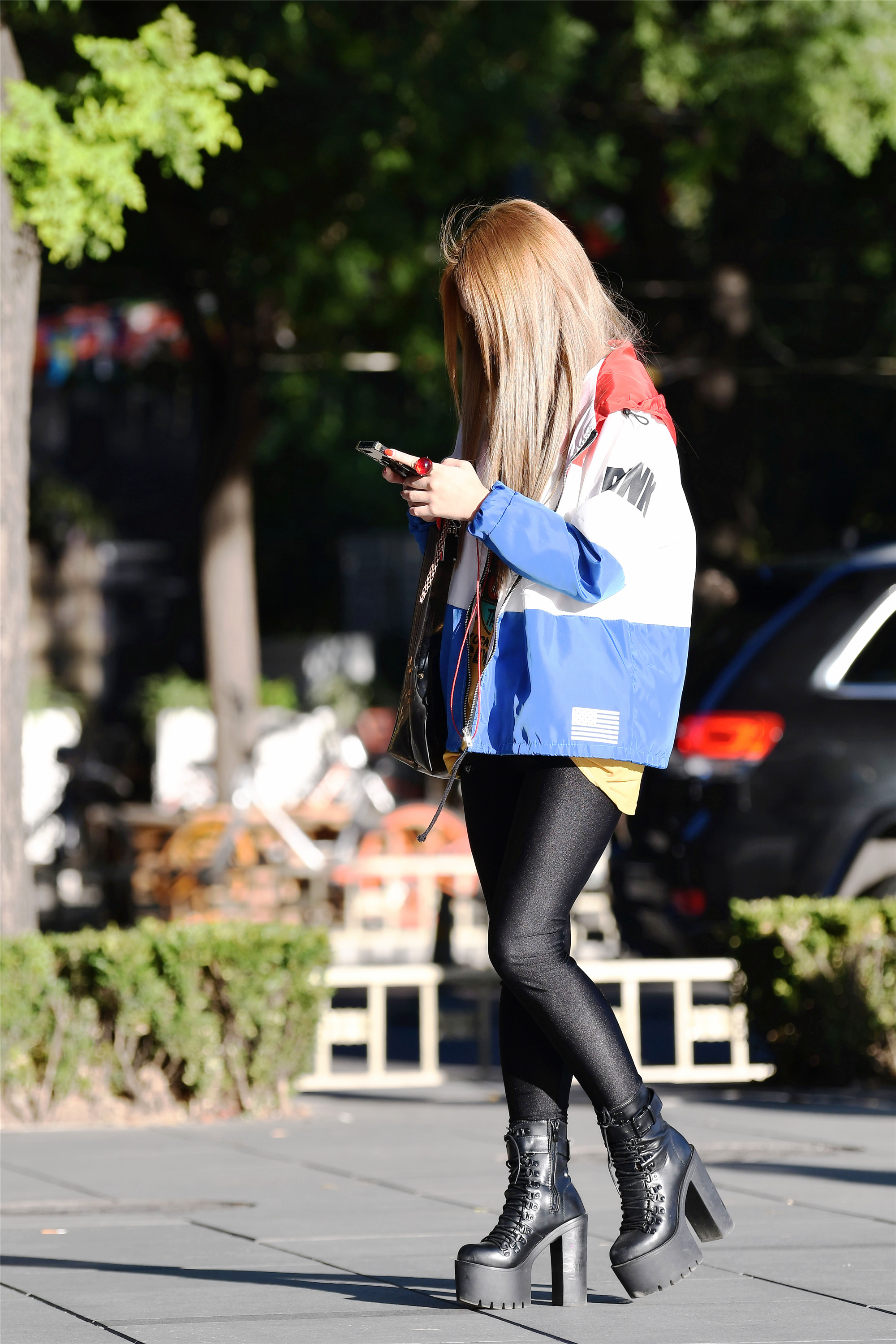 这位小姐姐身材会显得微胖,她用一条亮光的打底裤,这样带着反光感,会压低腿部周围的色彩,会显得她的腿部非常纤细,特别是在阳光下,效果更好,一双防水高台的粗跟鞋,喜欢这样鞋子的姑娘,一般年纪不大,穿这样的鞋子走路更稳妥,红白蓝相间的外套,更显的休闲和年轻的感觉。