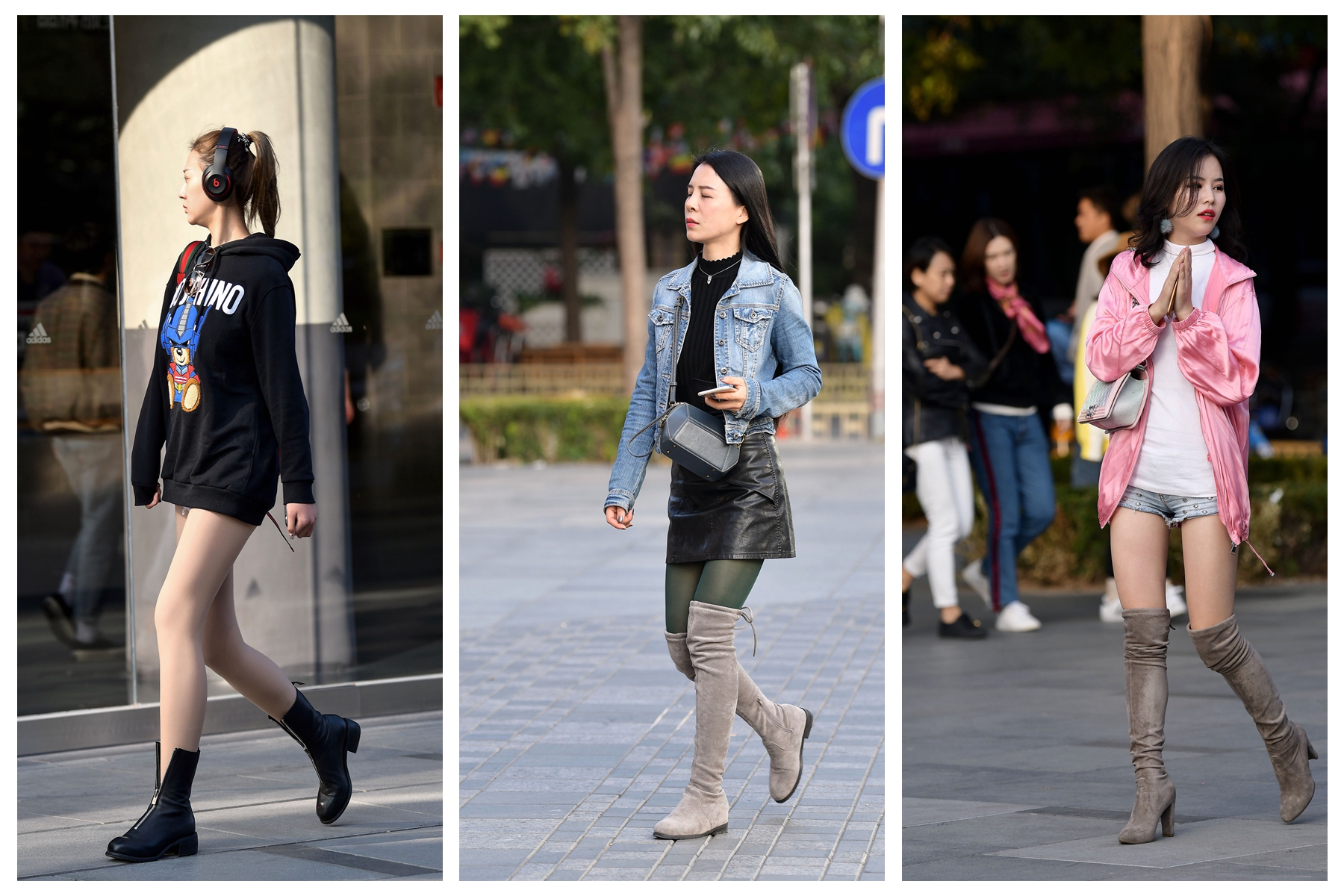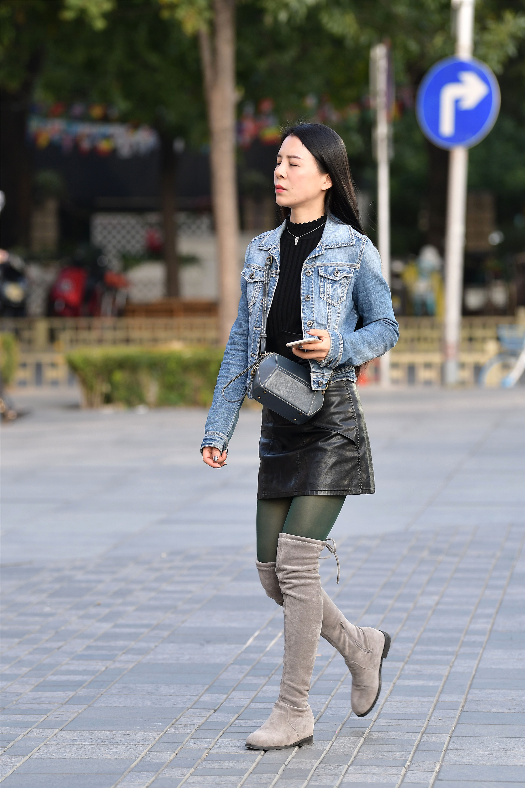 姑娘的皮裙搭配出了显身材比例的效果,蓝色牛仔服保暖还有个性,黑色高领衬衣与黑色裙子呼应,墨绿色的打底裤在皮裙和米色打底裤之间过度,身上多色搭配,却显得很自然。