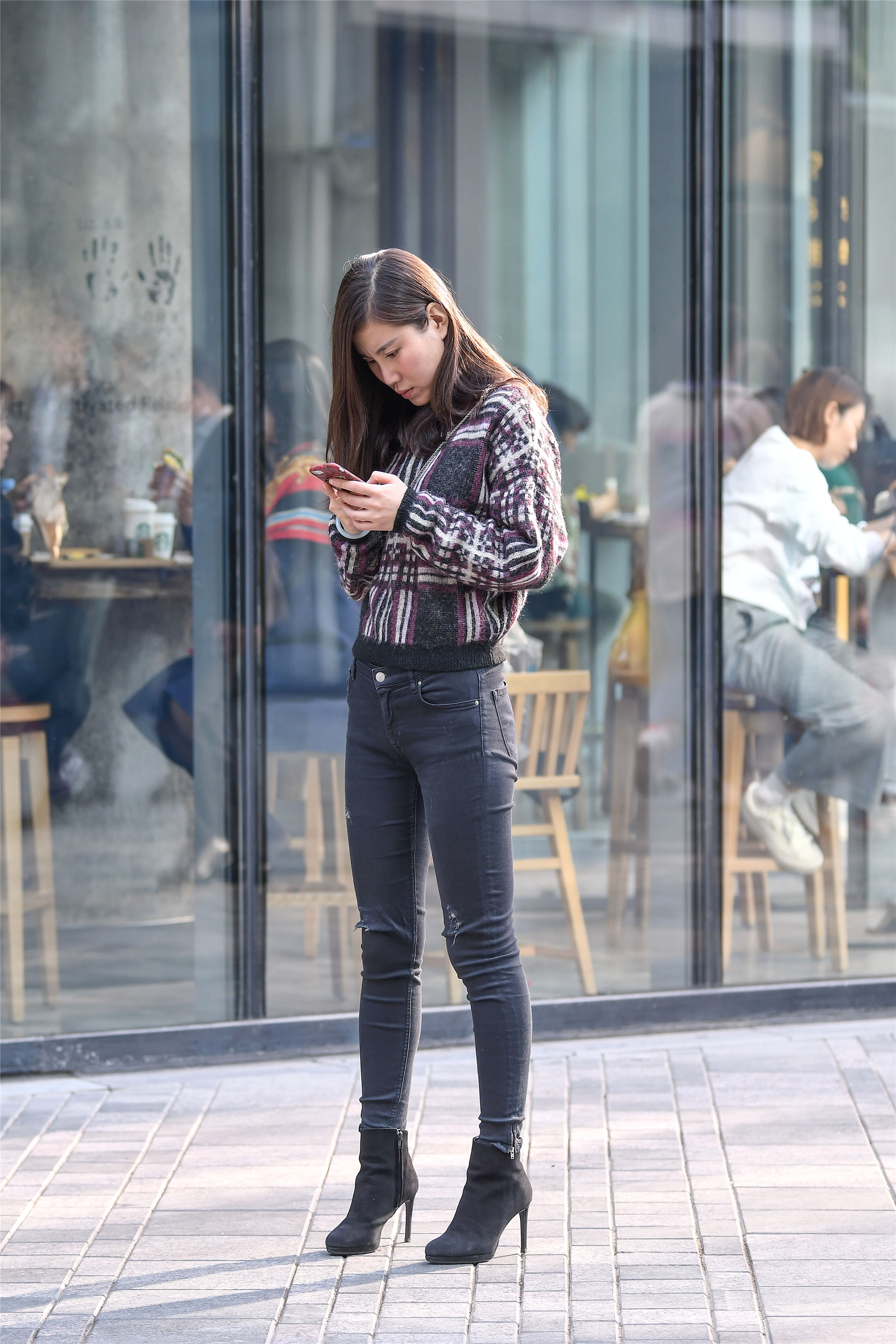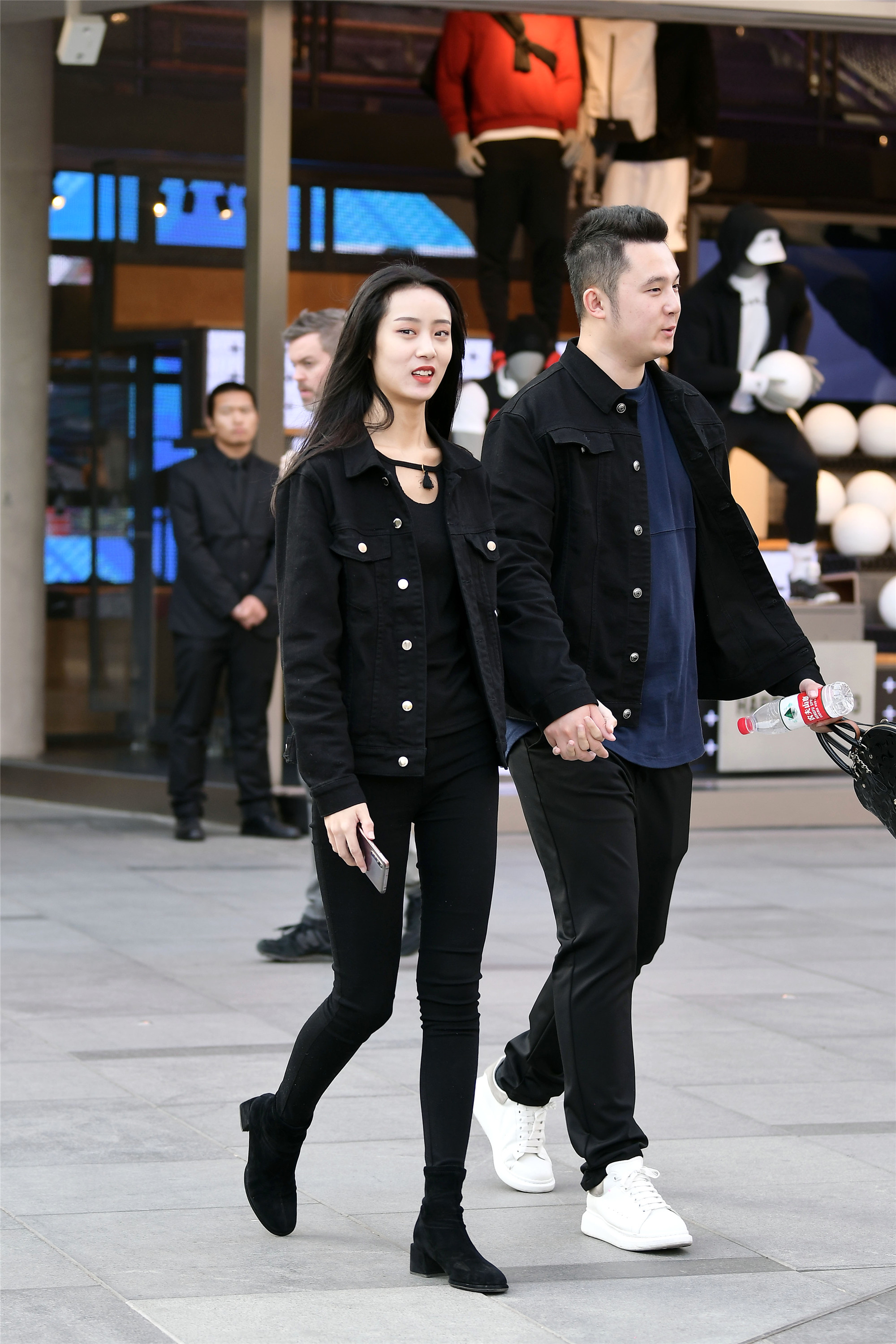 一身黑色搭配,黑色的牛仔修身裤,黑色鞋子和黑色外套,整体的一身黑色,却凸显出她身材的纤细,也能够感受她的高挑美感。