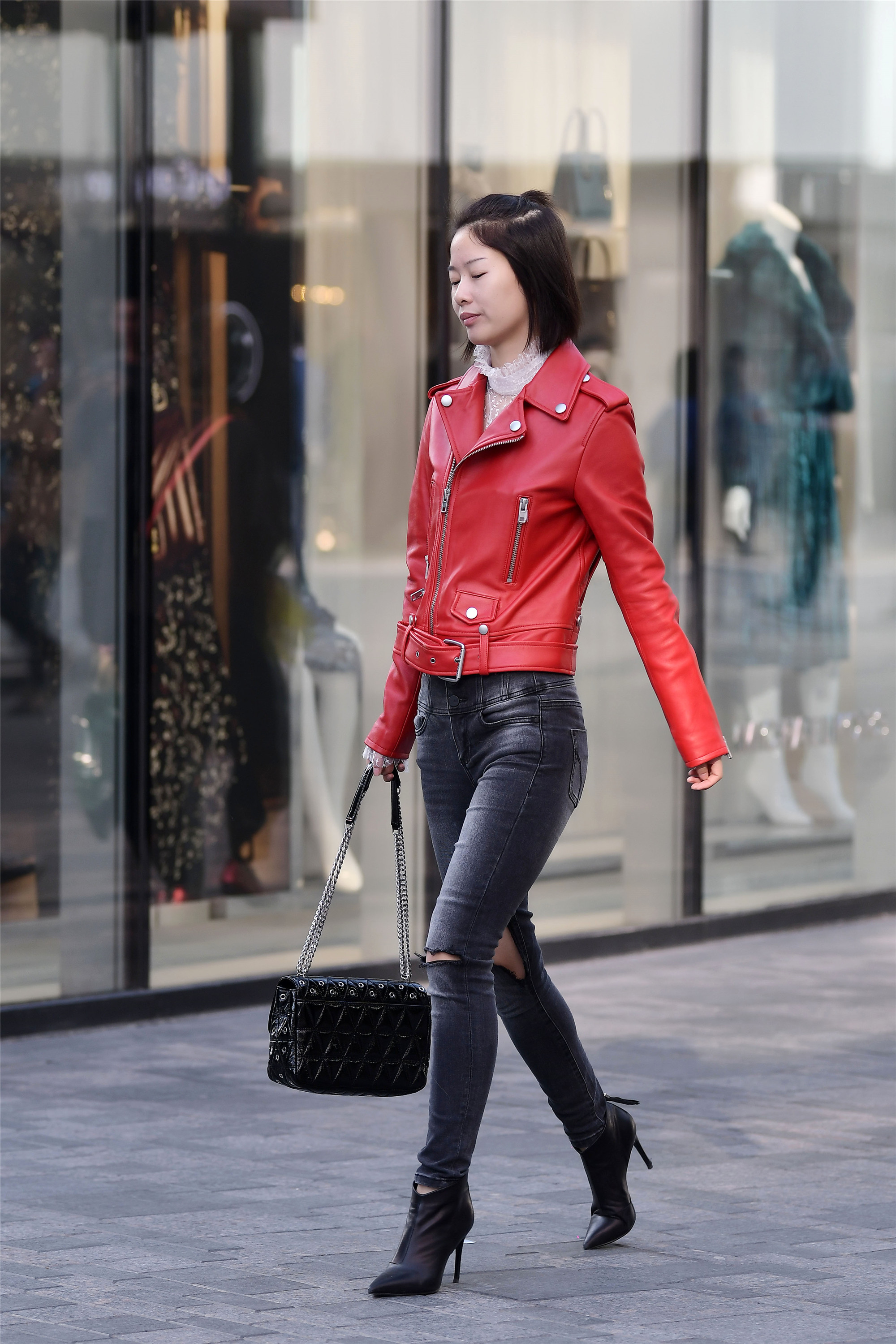 灰色牛仔裤,前边带着一点渐变的白色,这样会很显瘦,搭配一双细高尖头短靴,红色的皮夹克,短款的设计,和黑色形成撞色感觉,这样搭配出来的效果更有比例感觉。