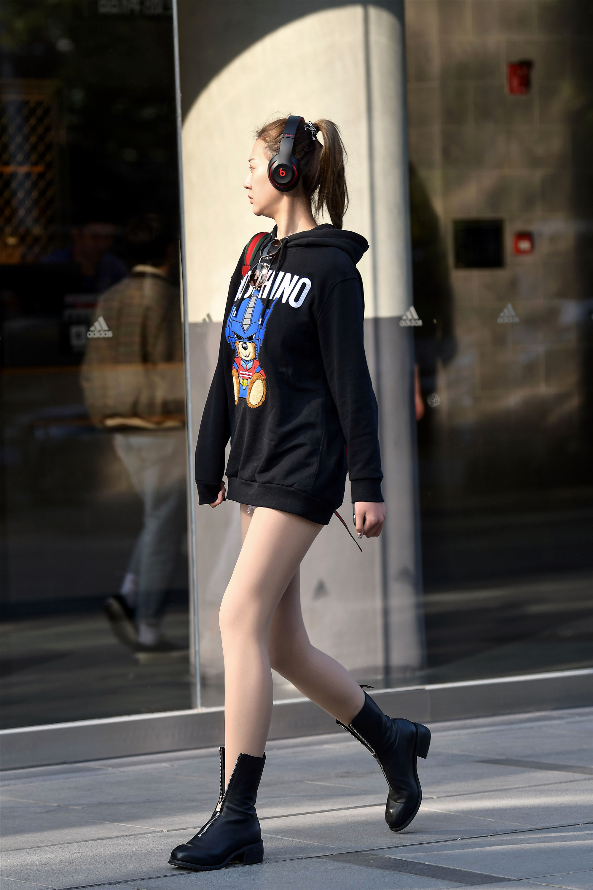 一件黑色卫衣,一双短靴,这是不怕冷的姑娘才敢这么的搭配,虽然她的比例不是很凸显,但是却让你感觉到她身材也是高挑的,而且还带着一点丰腴的味道。