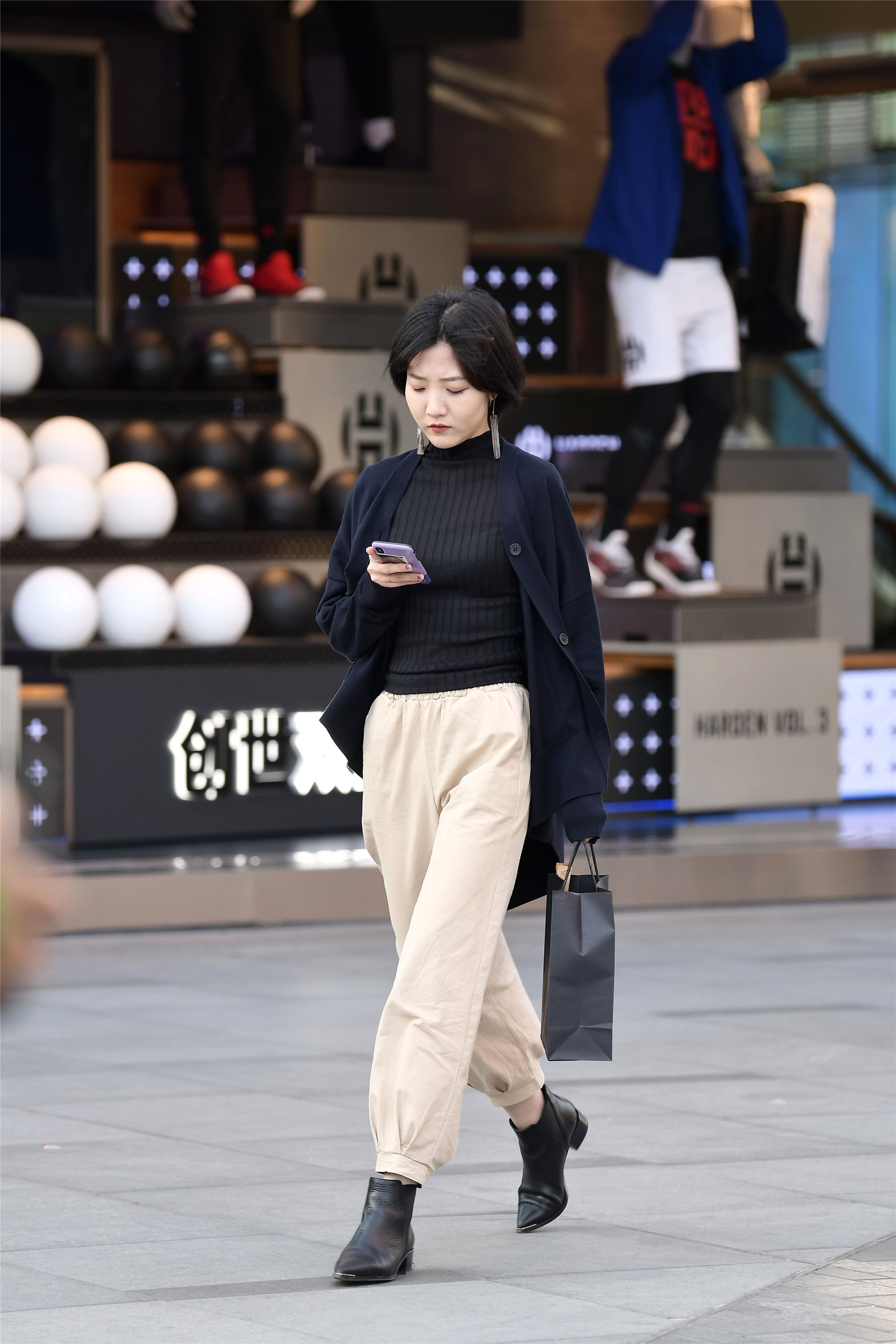 米色宽松的收脚高腰裤,黑色毛衣内搭和深蓝色外套,这样撞色的搭配,显出她拥有非常好的身材比例,短发搭配精致的面容,就是这样自然优雅。