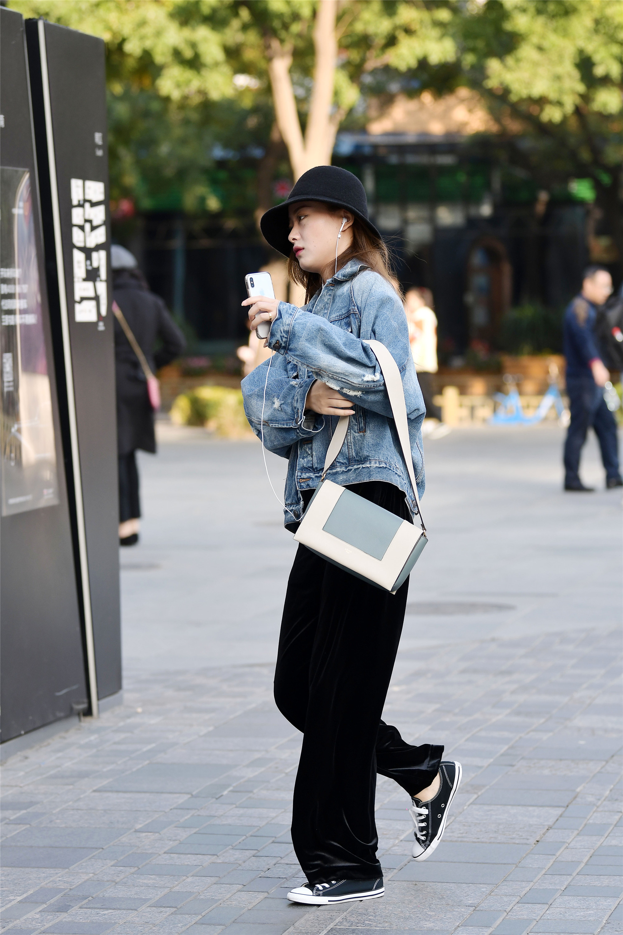 黑色高腰长裤搭配牛仔服,一顶黑色的帽子更显得低调,色彩也是秋天搭配的常见色彩,就是这样的简单服装搭配出不简单的时尚效果。