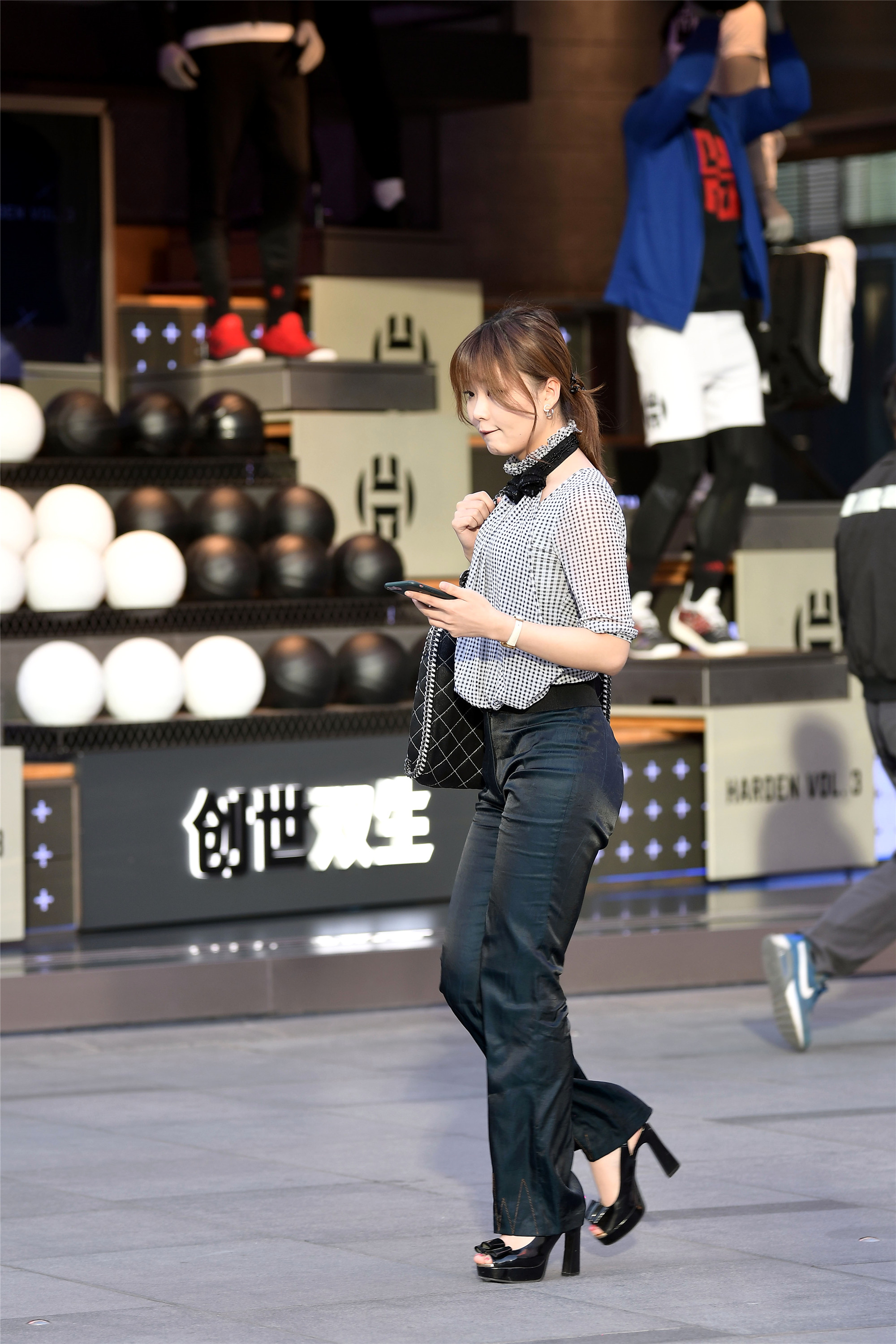 姑娘高腰裤搭配着一双粗跟的鱼嘴高跟鞋,白底黑点的挂脖小衫,与黑色高腰裤对比,不仅显身材比例,还有色彩差异。
