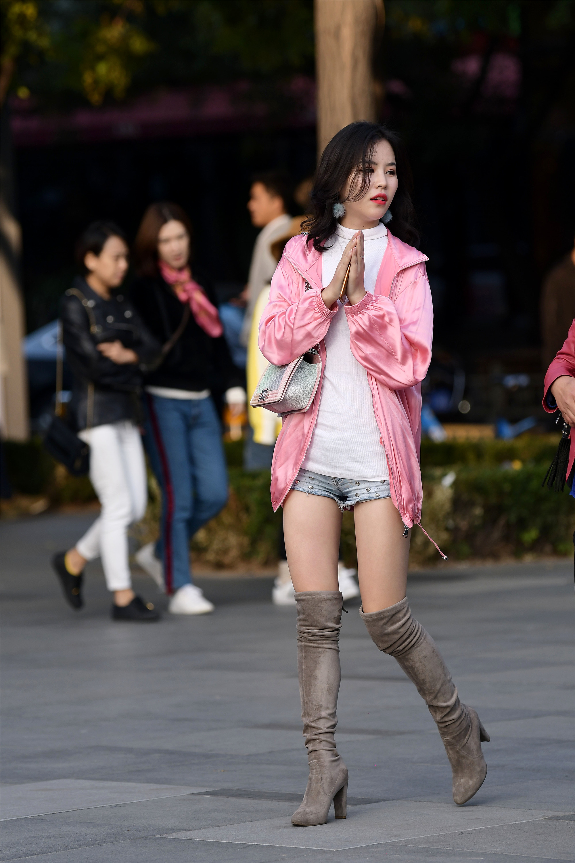 粉色外套和白色内搭,形成了一种对比,也很靓丽和减龄的感觉,牛仔短裤搭配一双灰棕色的过膝靴,姑娘身材纤瘦高挑,这样搭配出来的效果有靓丽年轻,秋天很少见到这么靓丽的搭配。