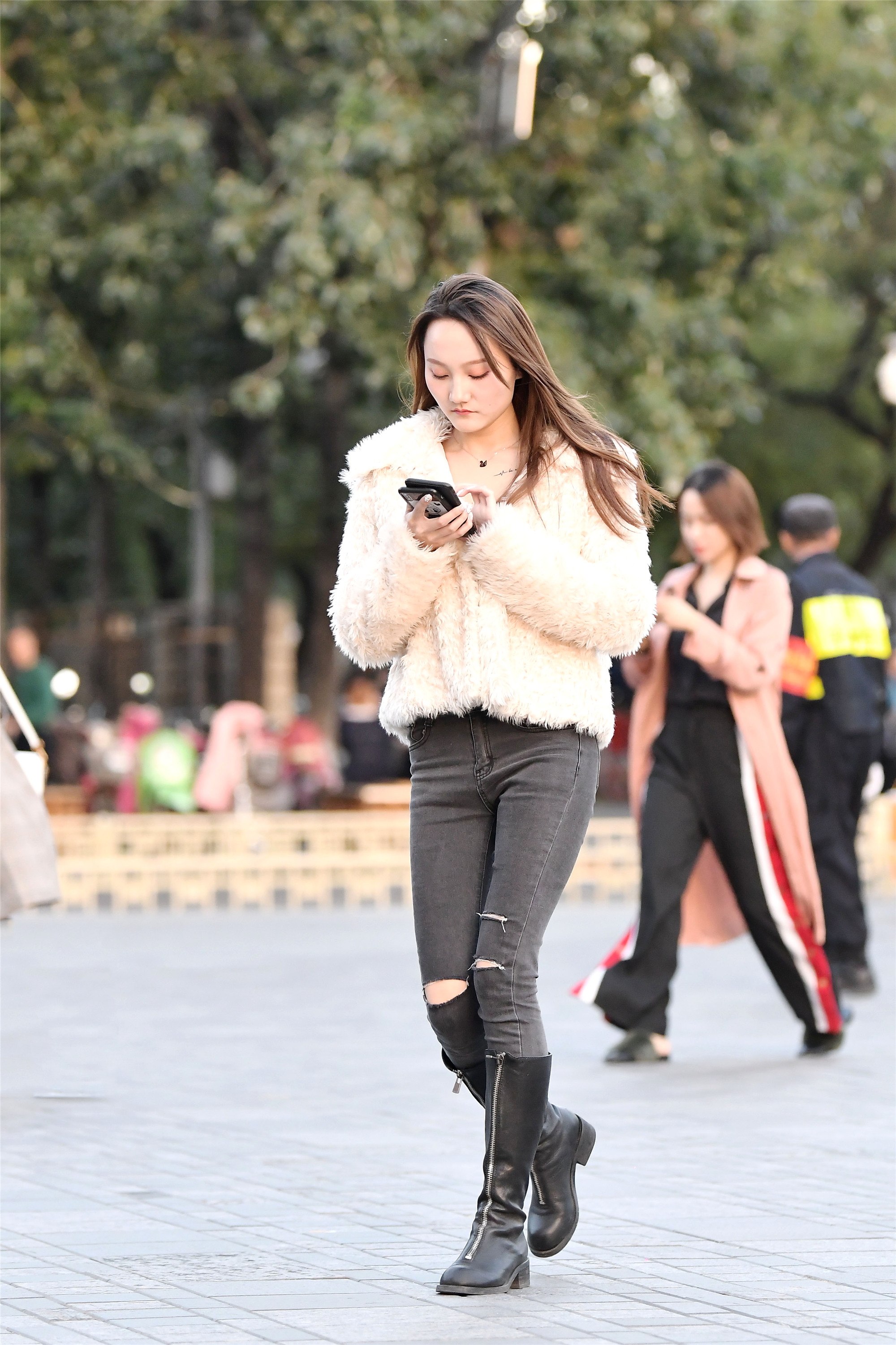 灰色牛仔裤,膝盖部分做了点破洞处理,是比较流行穿法,短靴前边的拉链非常有个性,带着金属感,毛绒绒的外套更显保暖,在这个季节穿暖也是很重眼的感觉。