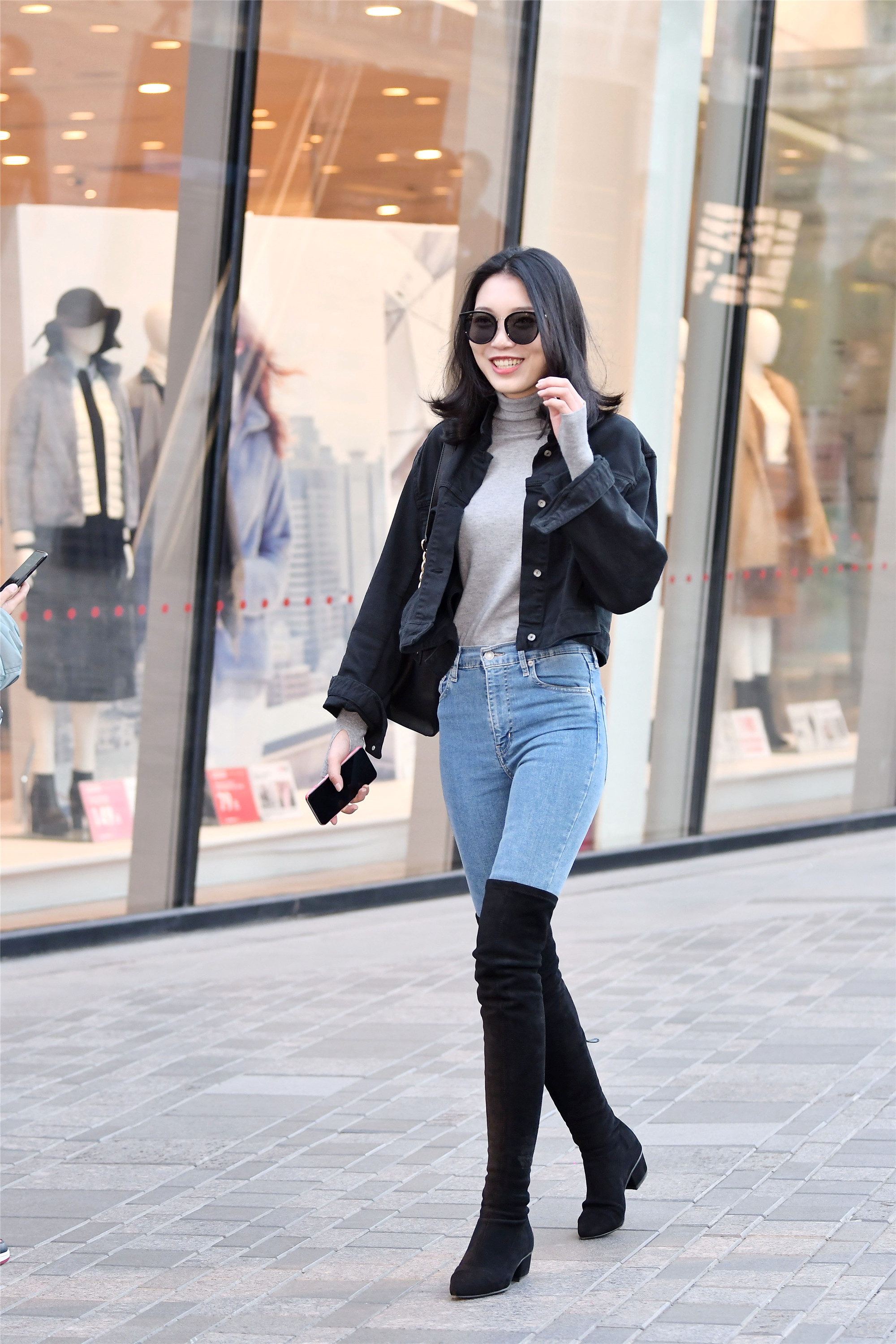 蓝色修身牛仔裤,是非常经典的款式,高领毛衣下摆被掖在高腰牛仔裤,修身的过膝靴,也是更好的搭配出一种高挑的感觉,黑色的短衣襟牛仔服,更有秋天的感觉。