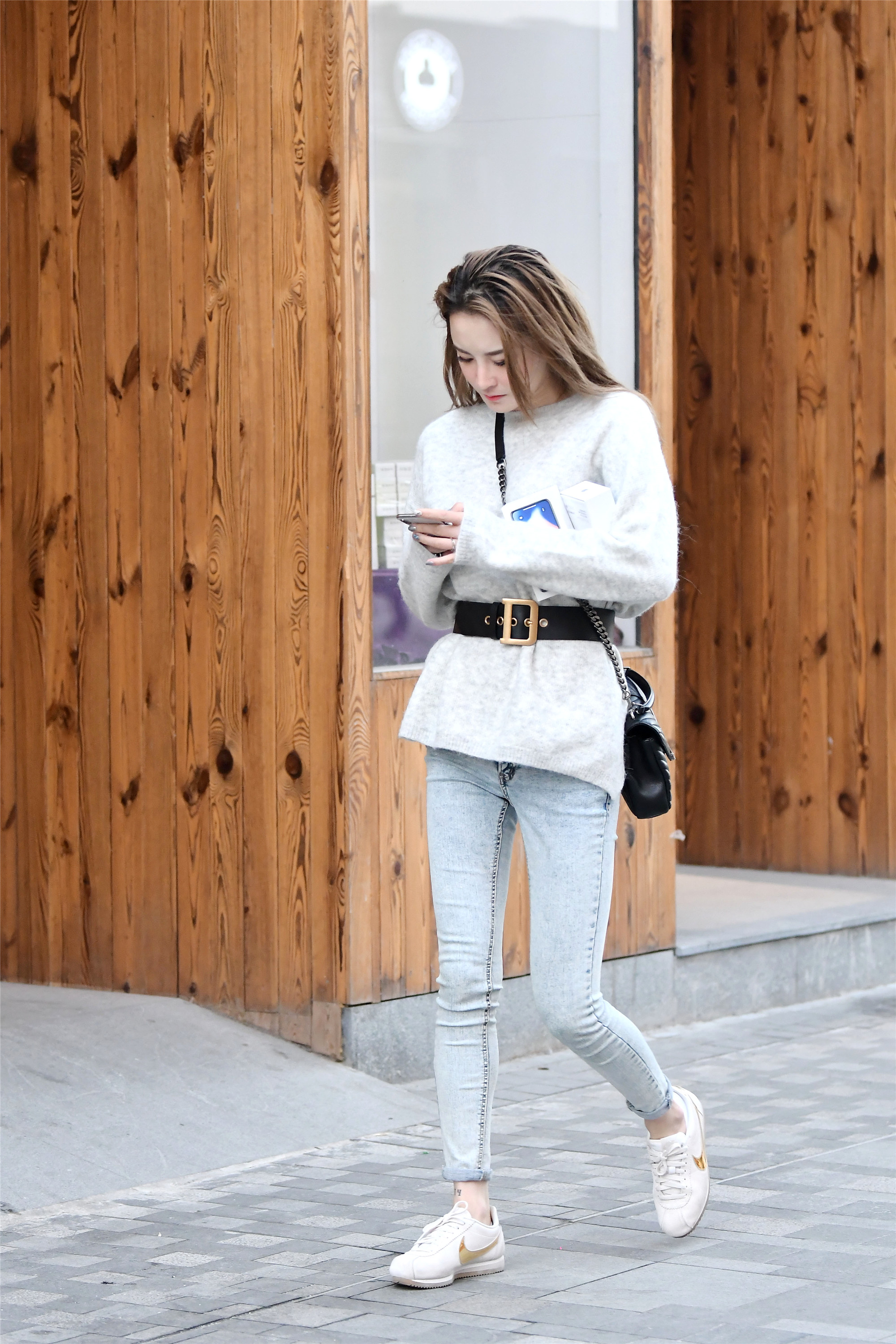 浅蓝色的修身牛仔裤,裤脚被姑娘挽起来,一双耐克平板鞋,更有个性,她的天空白的针织外套,被姑娘用一条黑色腰带做腰线,卡扣是金属个性的味道,腰线位置更加明显。