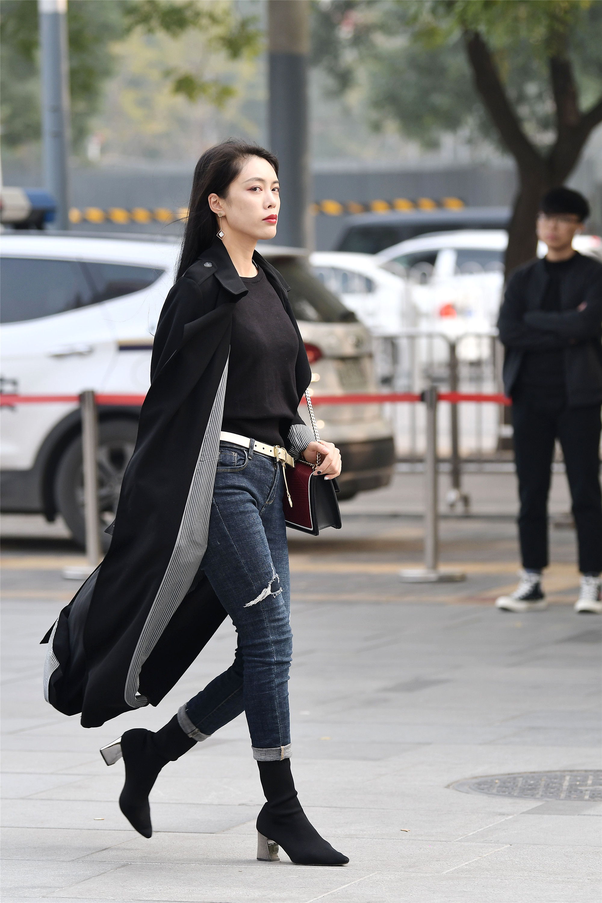 深蓝色修身牛仔裤,低腰的款式一点也没有显腿短的感,裤脚依旧被挽起,有七分窄脚裤的感觉,最精彩的搭配是她的风衣,姑娘大步走起来,恰好行风风度飘飘的感觉。