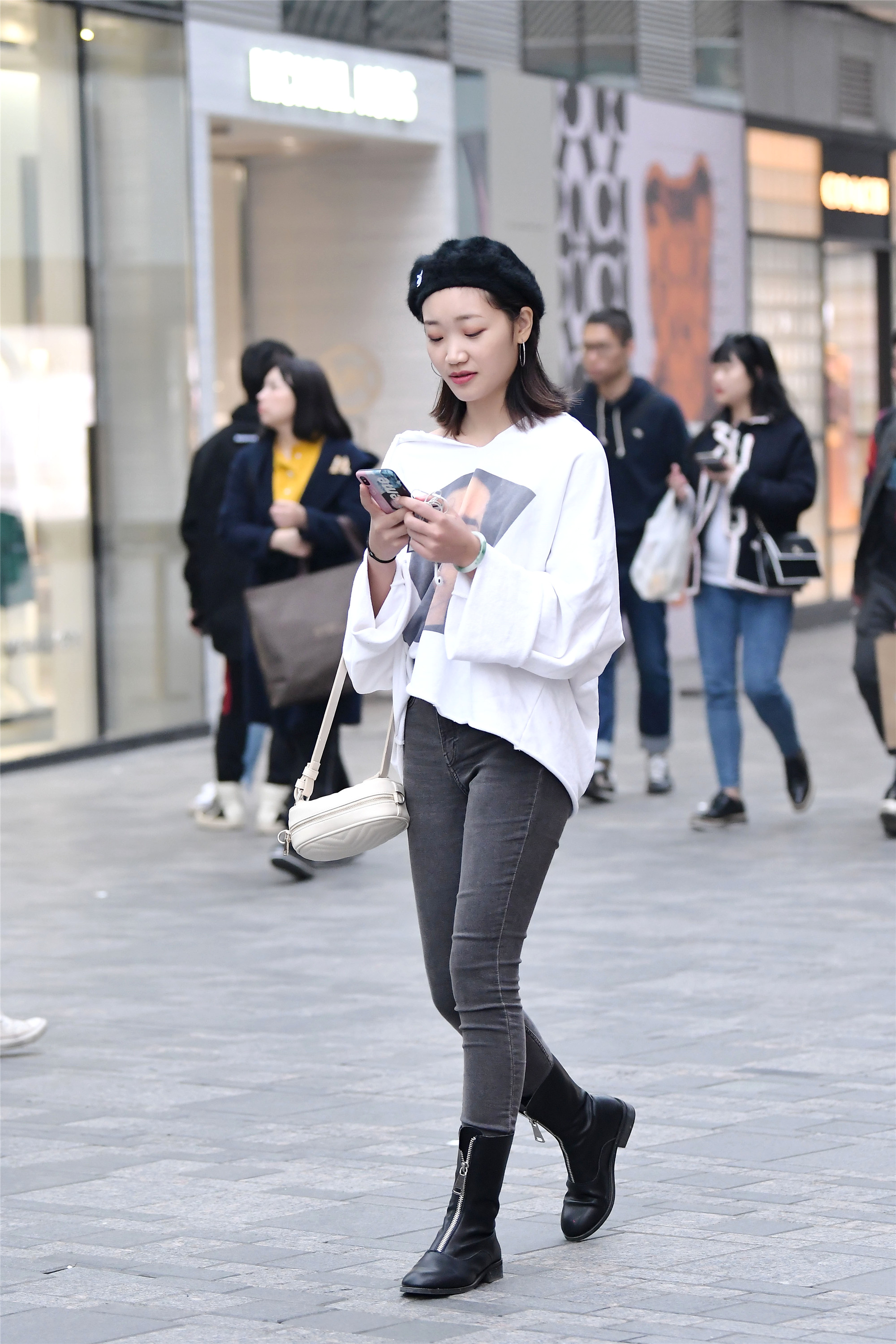 黑色的修身牛仔裤搭配一件白色的卫衣,卫衣一角特意掖在牛仔裤里面,这样可以显出腰线,也让身材显得高挑来,一顶毛绒绒的帽子,将头发很好的拢在后面,更显得精致一些。