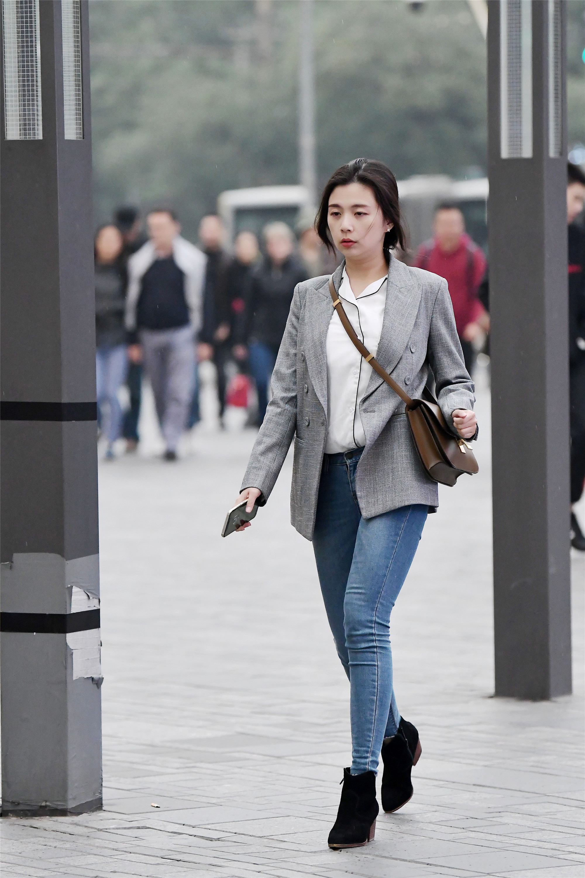 牛仔裤和西装搭配,是不是感觉混搭风味十足,一双黑色粗跟短靴,一件白色内搭,虽然搭配都是冷色系,却显得秋天味道十足的搭配,简单富有层次。