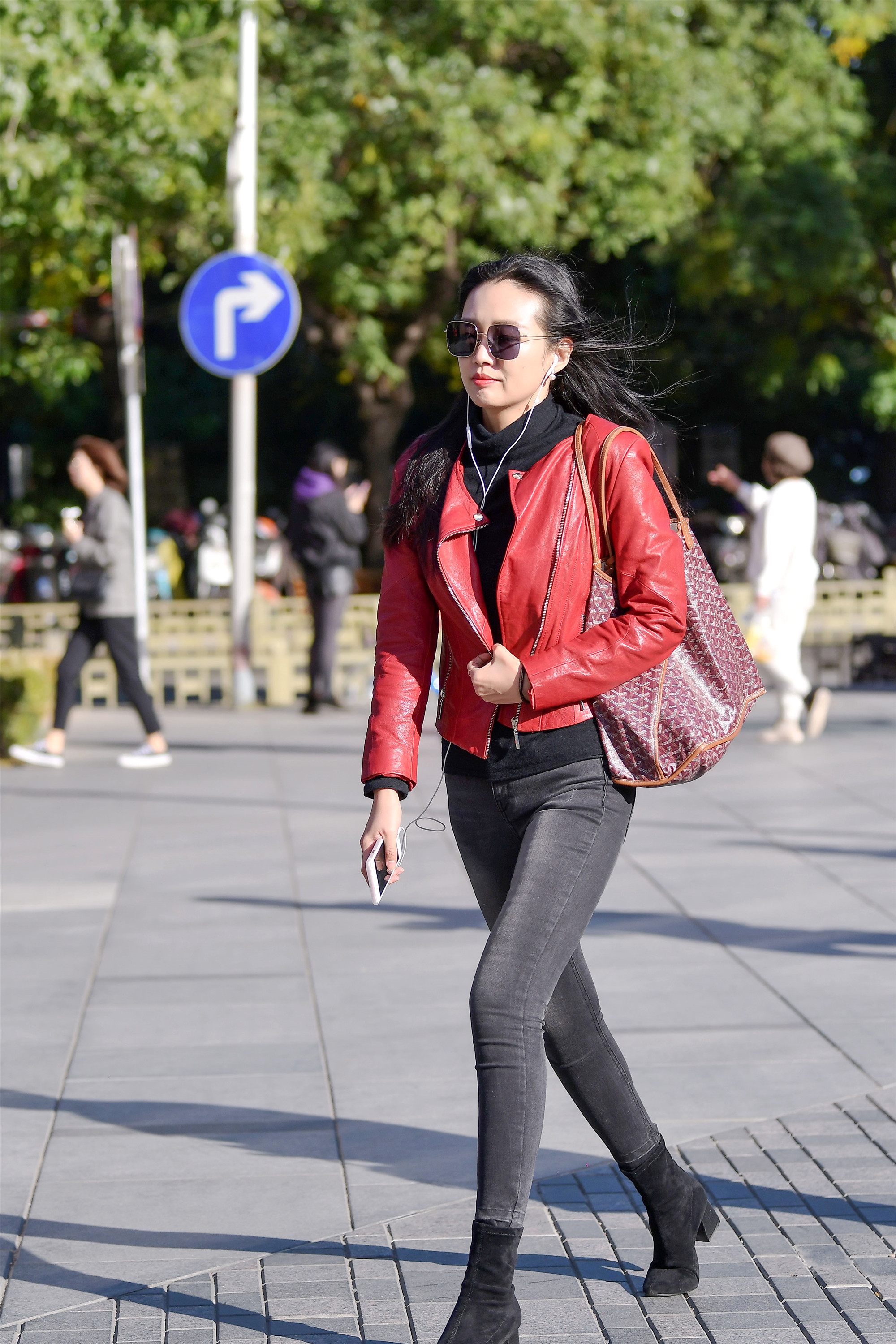黑色修身牛仔裤,到了秋天就有很多人穿,黑色也会很显瘦的色彩,一双绒面短靴,和牛仔裤形成一个渐变过度,也会看着更显修长,红色的皮夹克与黑色内搭,非常有个性,而且小姐姐面容非常精致。