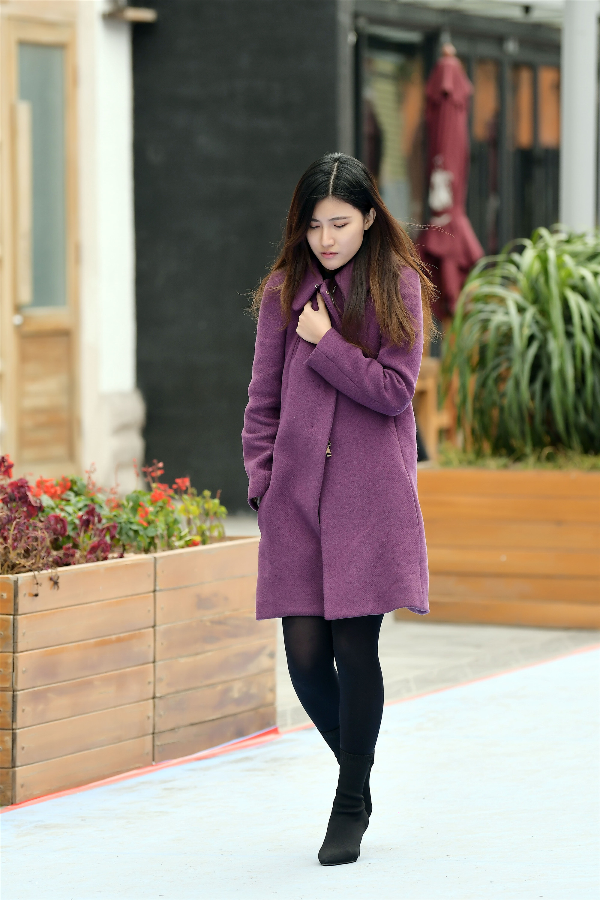 紫色的风衣,带着靓丽的感觉,偏暗的色调,还是会有十足秋装的味道和色彩,一条黑色打底裤和一双黑色尖头细跟的袜靴,简单的搭配,就可以过这个秋天。