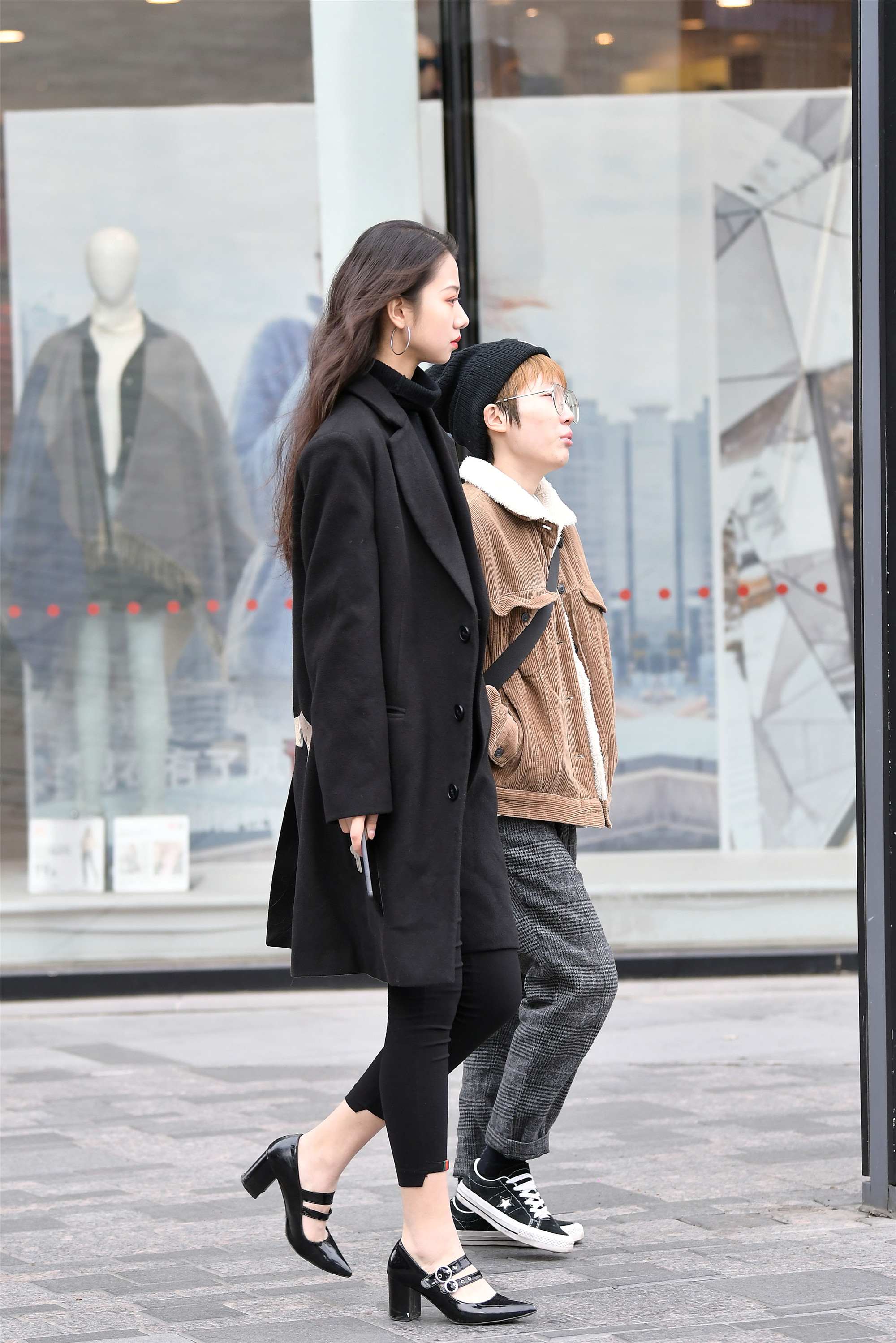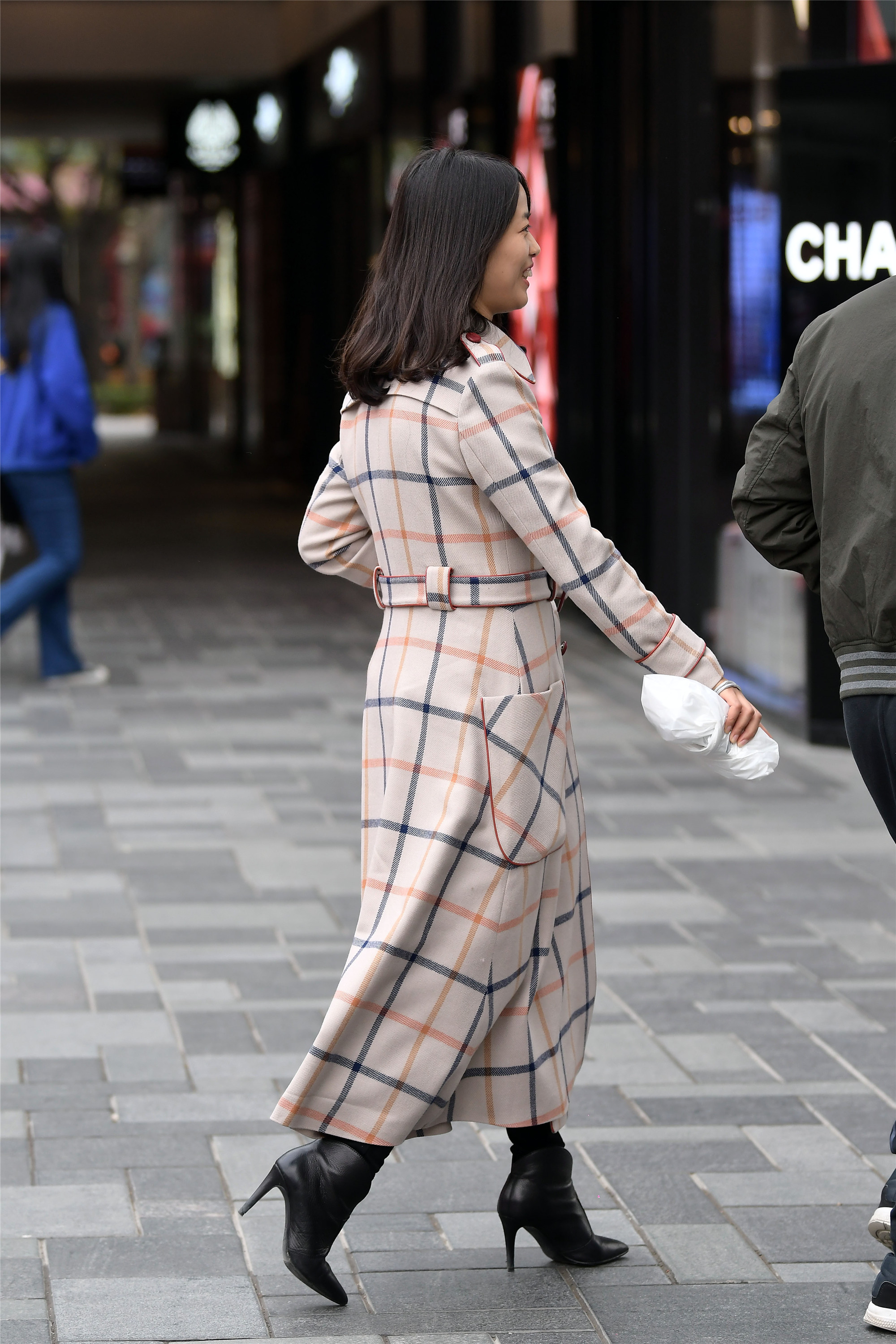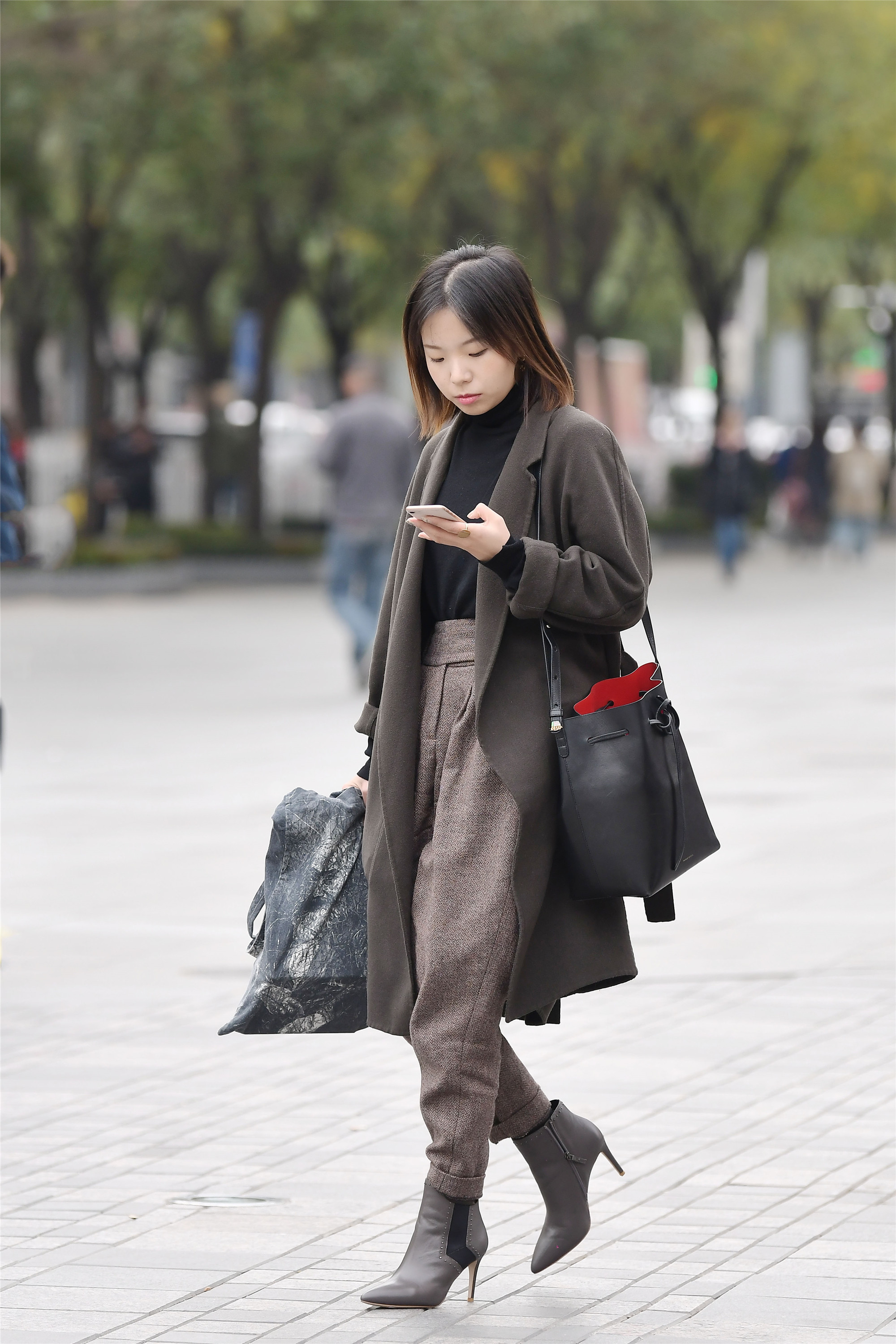小姐姐深灰色的风衣,黑色内搭,高腰的小格子窄脚裤风格十足,一双尖头细高跟短靴恰好和窄脚裤相接,身材比例看起来特别突出,简单的小女生搭配还非常显气质。