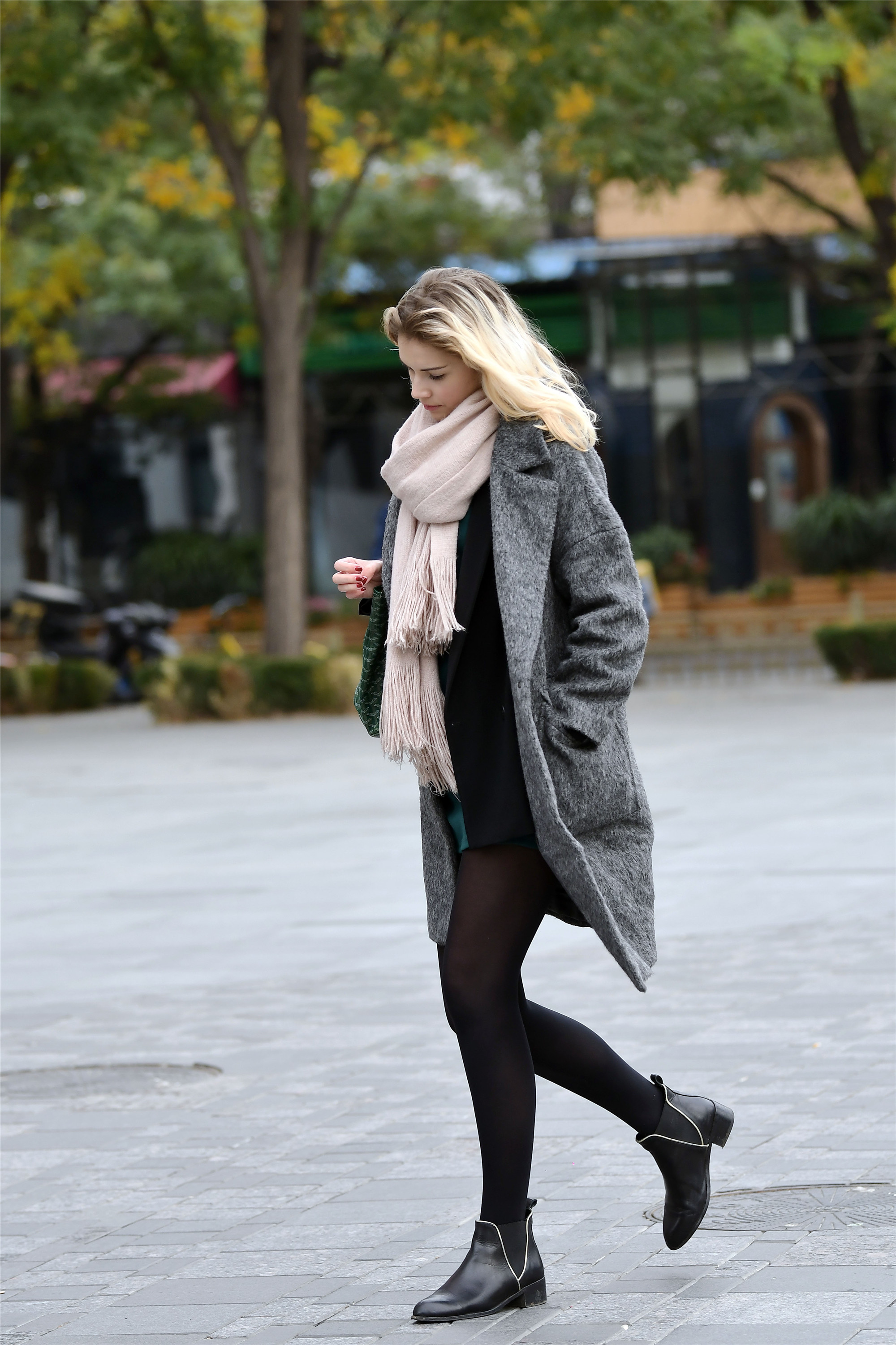 秋天的暗色调搭配,需要身材好一点才能搭配出效果来,如果你对身材自信,那么可以这样搭配,麻灰色风衣搭配黑色连衣短裙,黑色打底裤搭配黑色平底皮鞋,用围巾来保暖,染过的金色秀发也很不错。