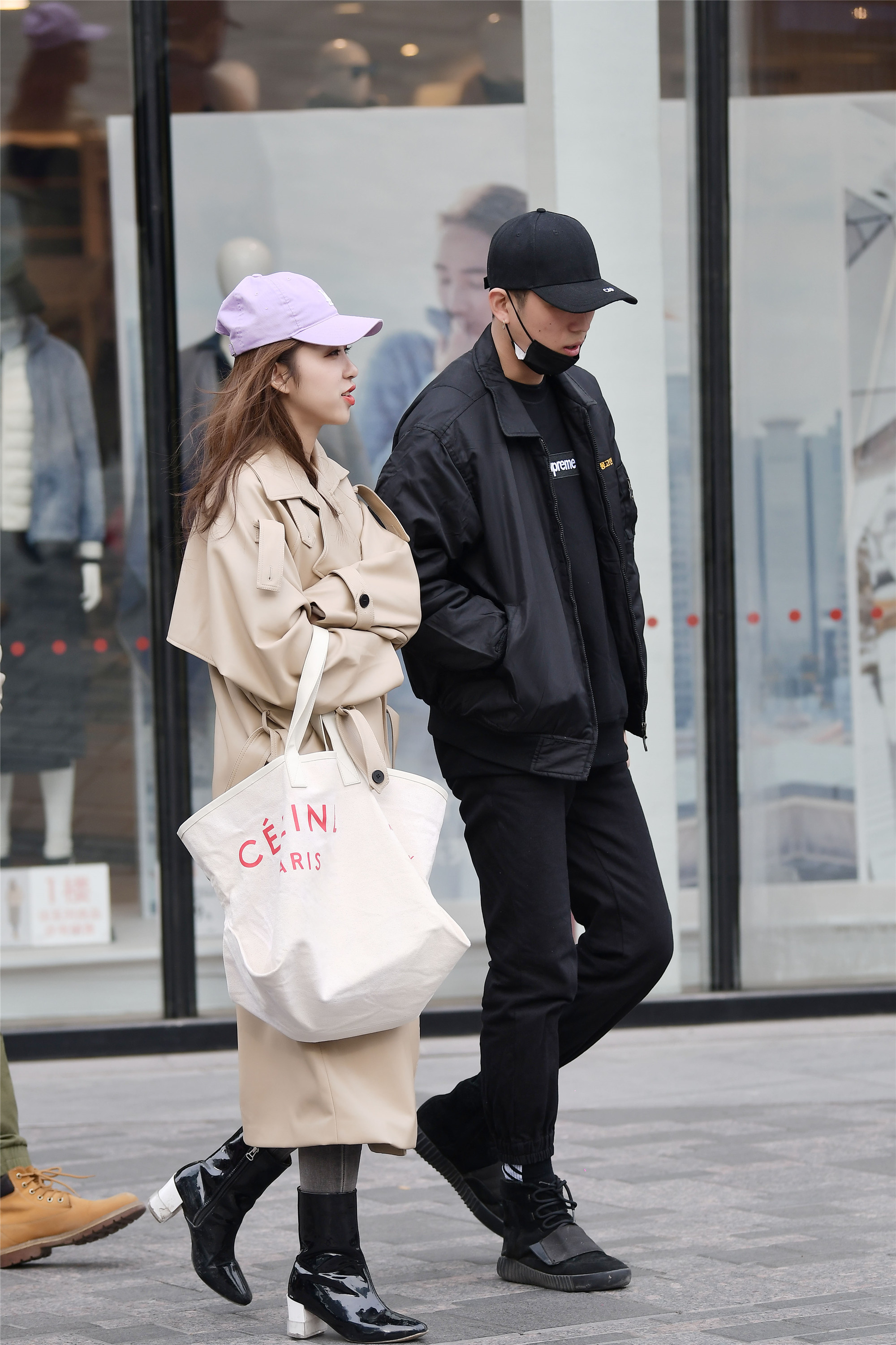 米色风衣,加长版的款式,让本来就不胖的姑娘,显得更瘦,也富有层次感觉,她的一款白色大包,应该能装很多东西,紫色的鸭舌帽,聚拢着长发,一双漆皮粗跟短靴很漂亮。