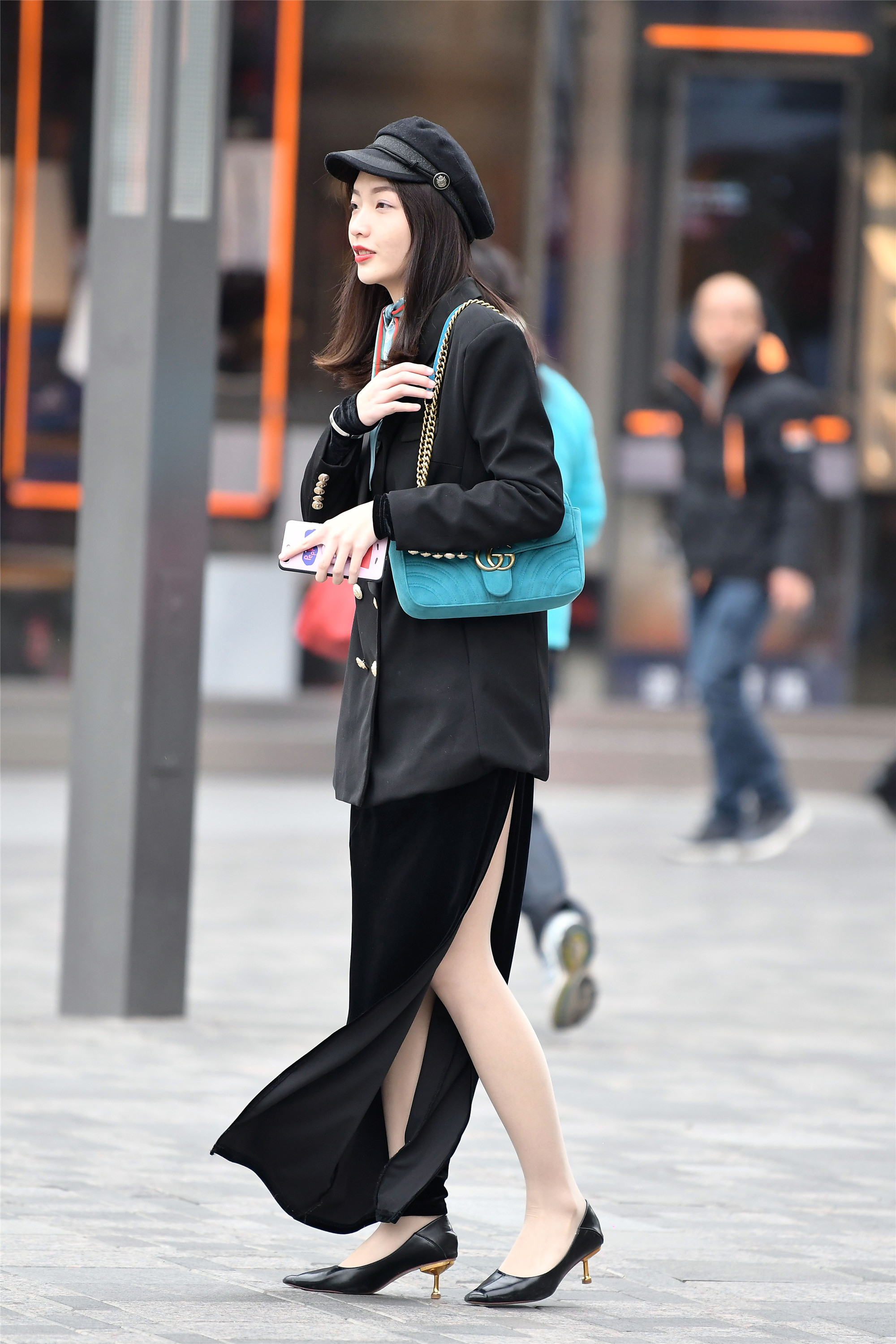 姑娘休闲西装搭配一条侧开叉长裙,而选择的帽子也是非常有个性的,黑色的服装搭配秀出修长的腿部,一双低跟的尖头细跟鞋,更增添一份妩媚味道。