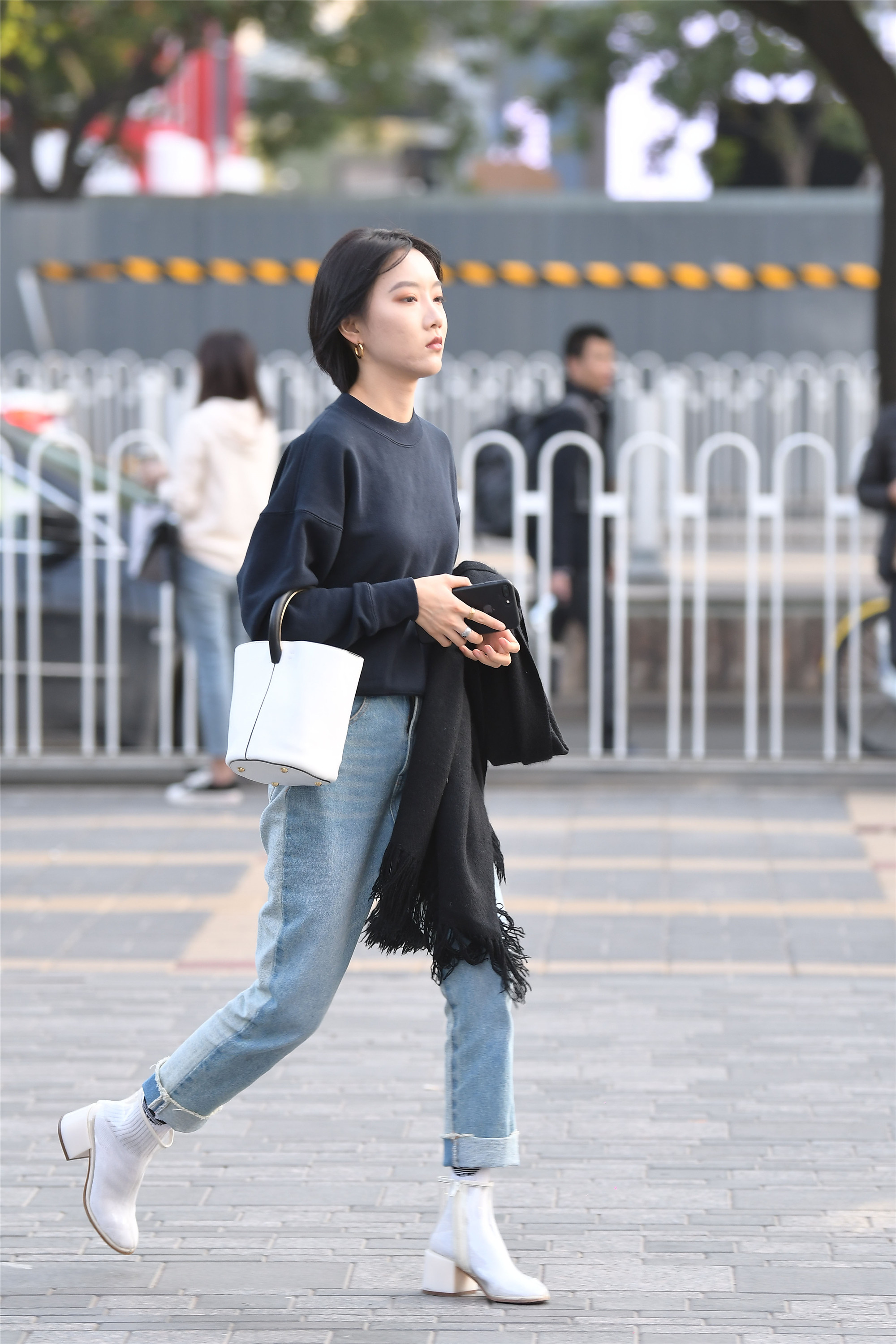 浅灰的的卫衣,搭配黑色牛仔裤,一双白色小短靴,嘟嘟嘴的感觉,非常有个性。