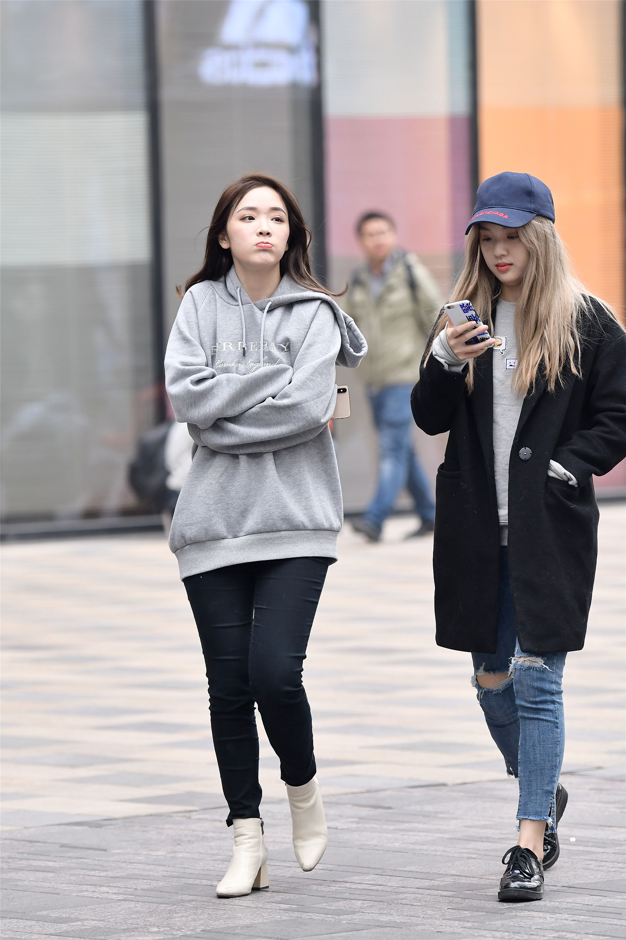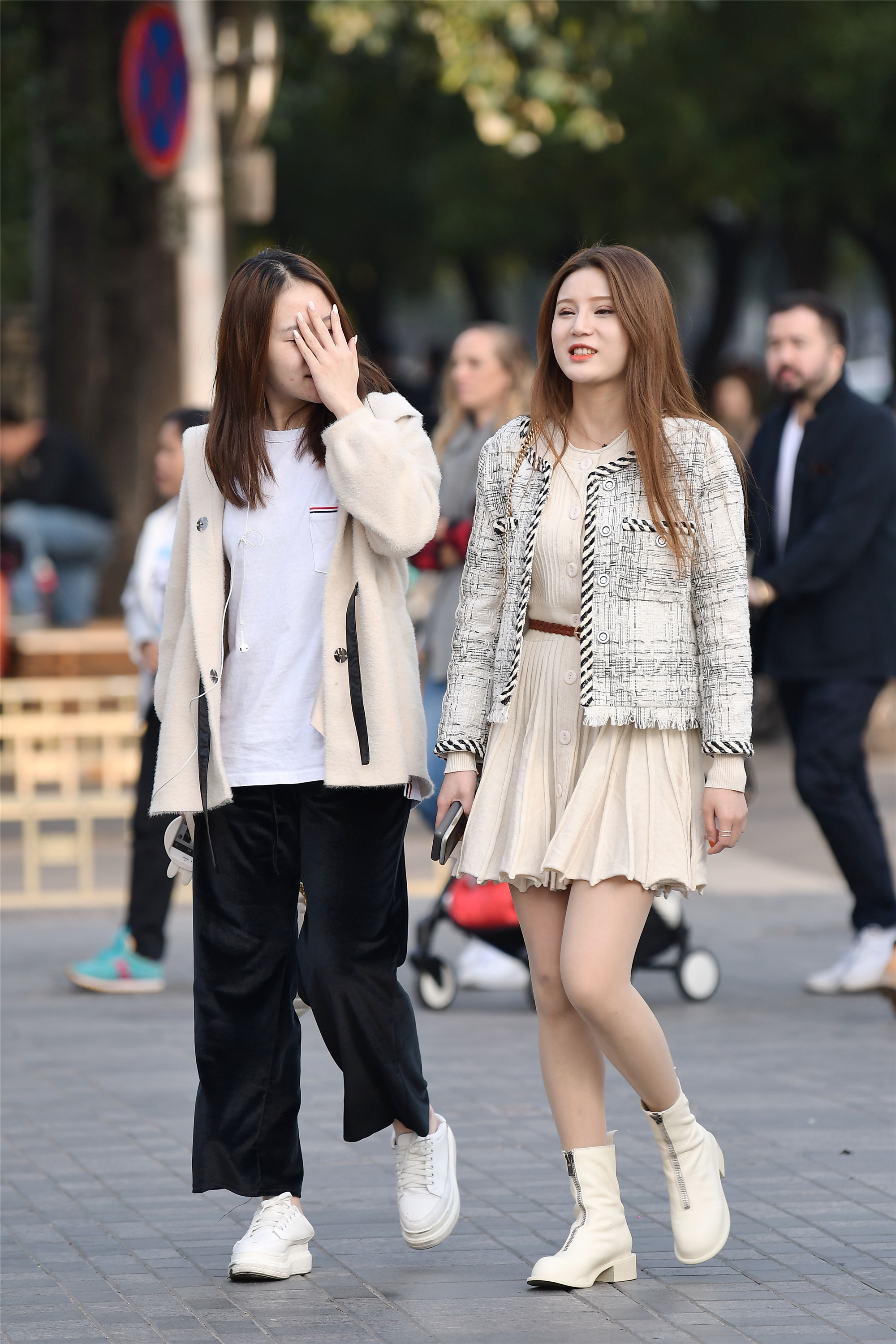 这是一对闺蜜出行逛街,她们搭配出不同的风格,一位休闲中有着小女生的感觉,一位是裙子和小外套搭配着白色小短靴,更显的女人一些。