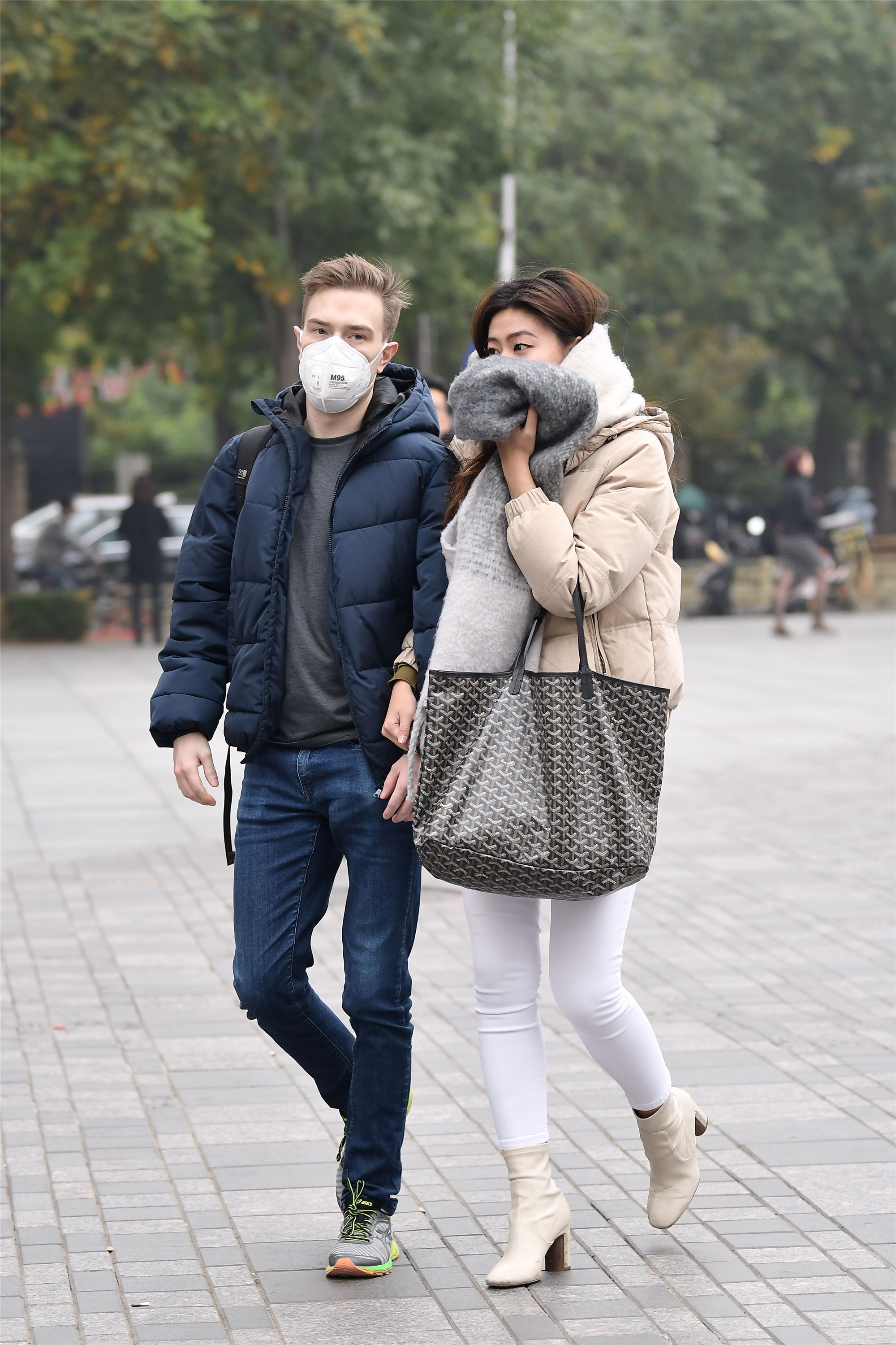 浅色系搭配的也是很不错的,米色的羽绒服浅灰色针织围巾,白色的修身牛仔短裤,也是穿一双小白鞋,简单的色彩,却干净清爽效果。