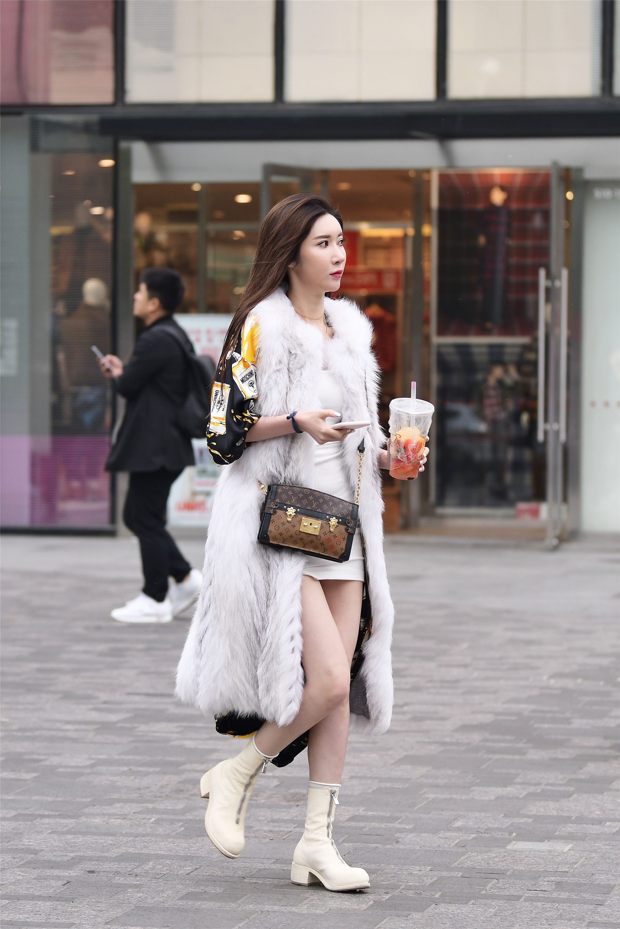 皮草大衣搭配一件白色短裙,一双白色短靴,让你觉得她的搭配非常靓丽的感觉,到了深秋,很多人的衣服开始加深,但是她的搭配却还是以白色为主,很漂亮。