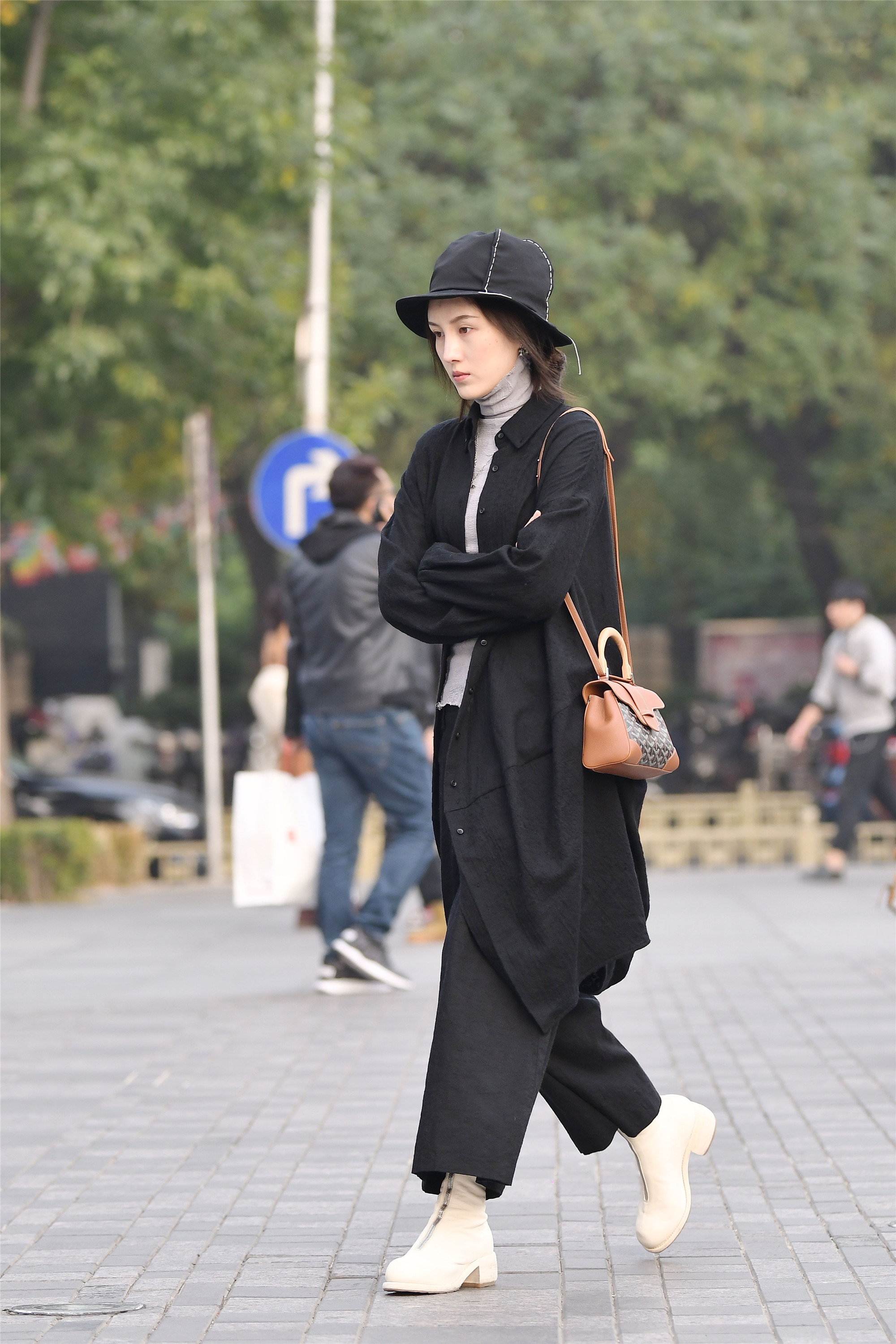 这位姑娘一身高级的针织灰非常漂亮,针织的风衣,针织的高领衫,针织长裤,搭配一双白色小短靴,这是唯一不同的色彩,却更显个性。