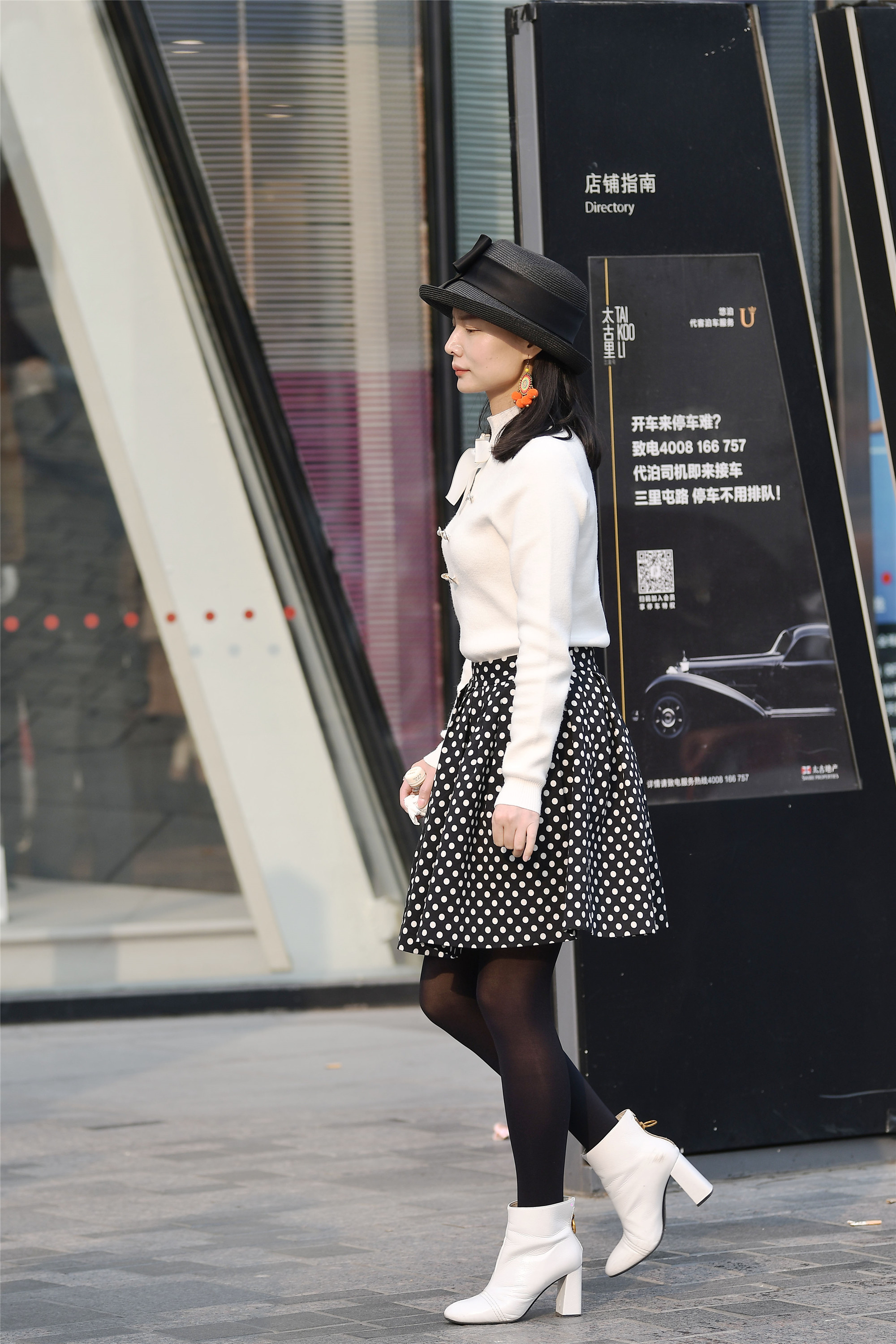 小礼帽,显得非常高级的感觉,白色衬衣搭配斑点高腰裙子,黑色打底裤搭配一双白色高跟短靴,色彩上虽然是黑白的搭配,却层次感和对比味道十足。