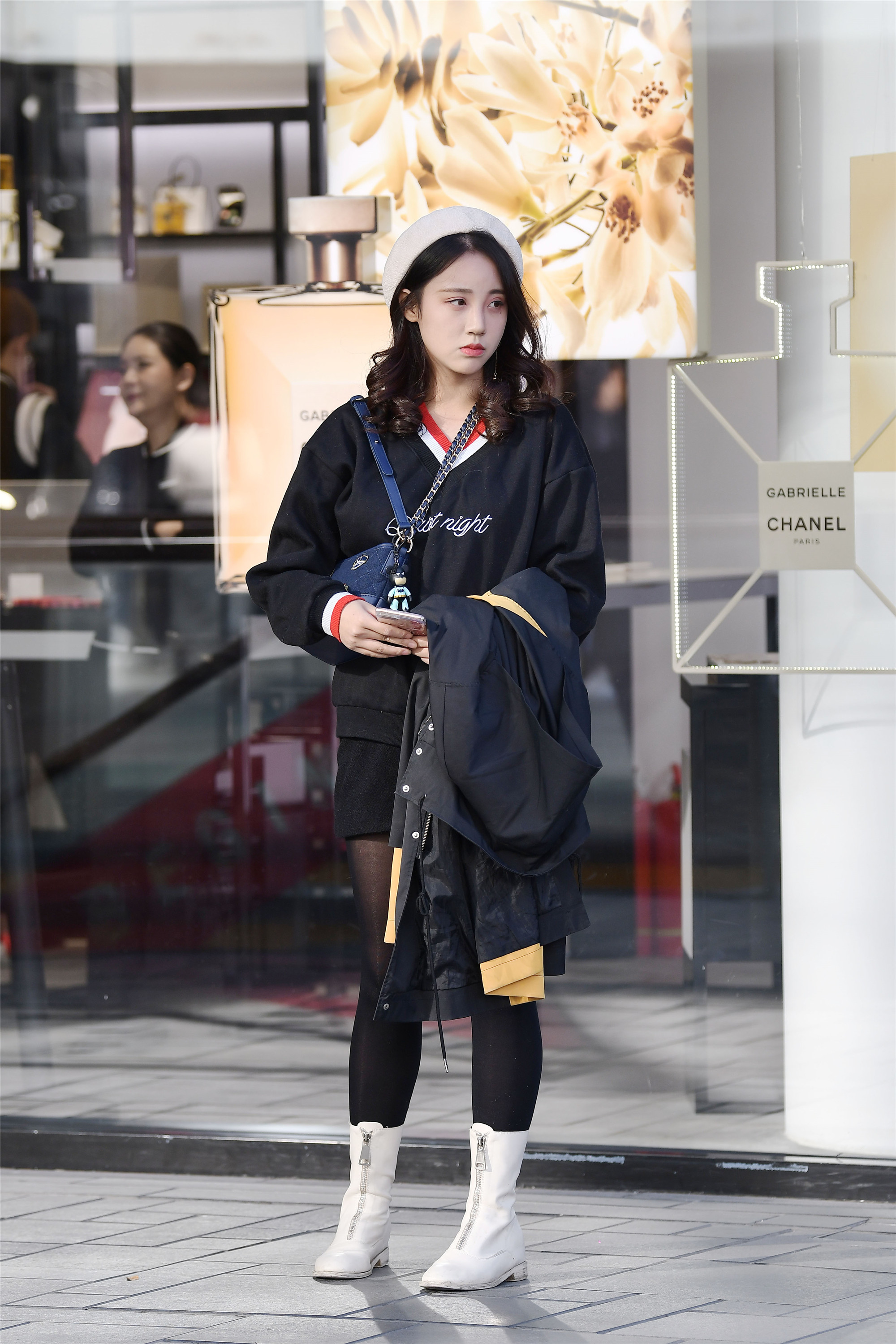 很喜欢小姐姐的白色帽子,似乎带着光环的感觉,她的黑色卫衣搭配的短裙,风衣搭在自己的胳膊上面,一双白色短靴和她的帽子相呼应,非常漂亮。