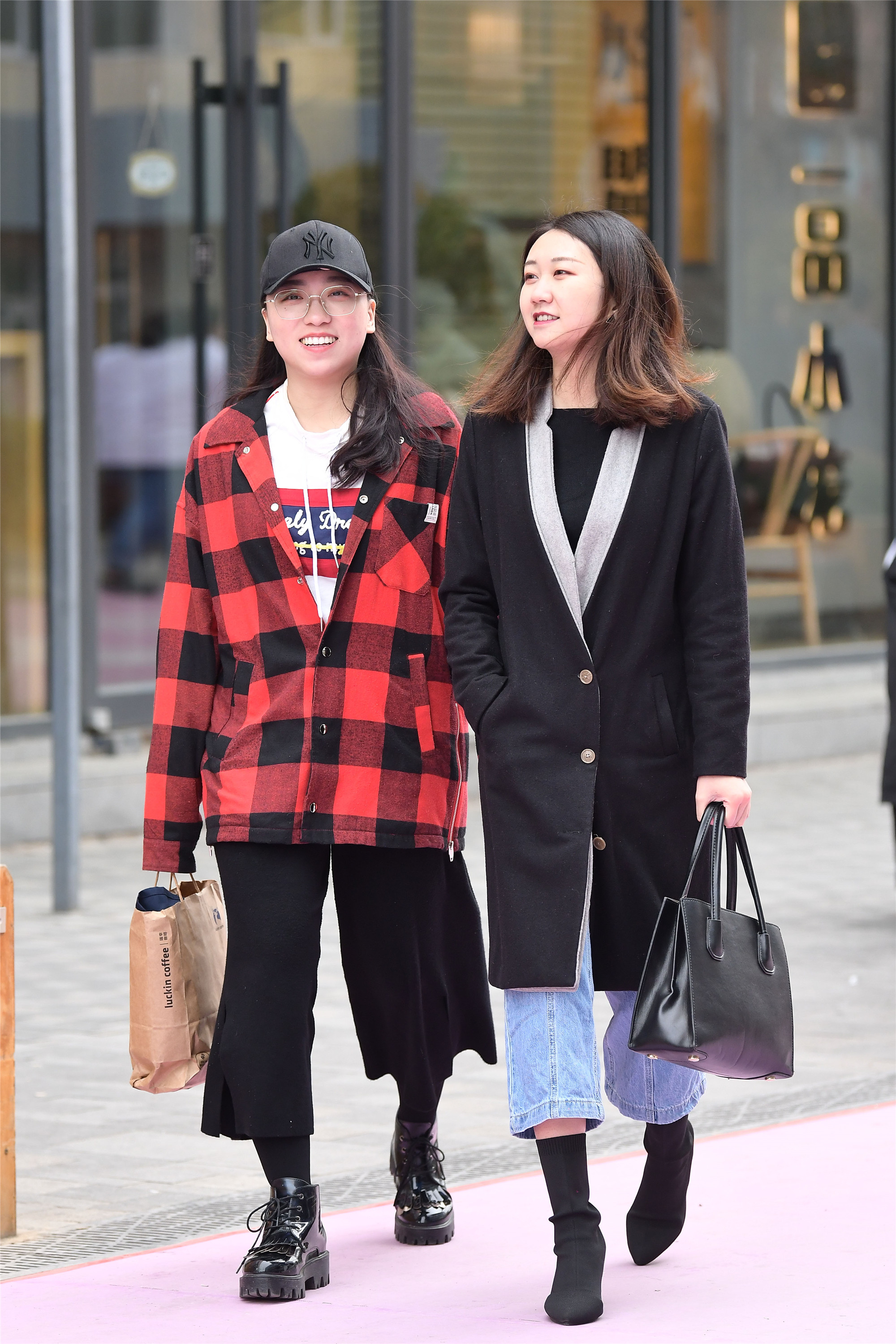 逛街对于女生来说,是一件非常开心的事情,很少有人不喜欢逛街的,和闺蜜好友逛街,更是一件幸福的事情,有说有笑,而且她们都很会穿搭,红色短大衣和黑色长版风衣相搭配,更好的衬托彼此。