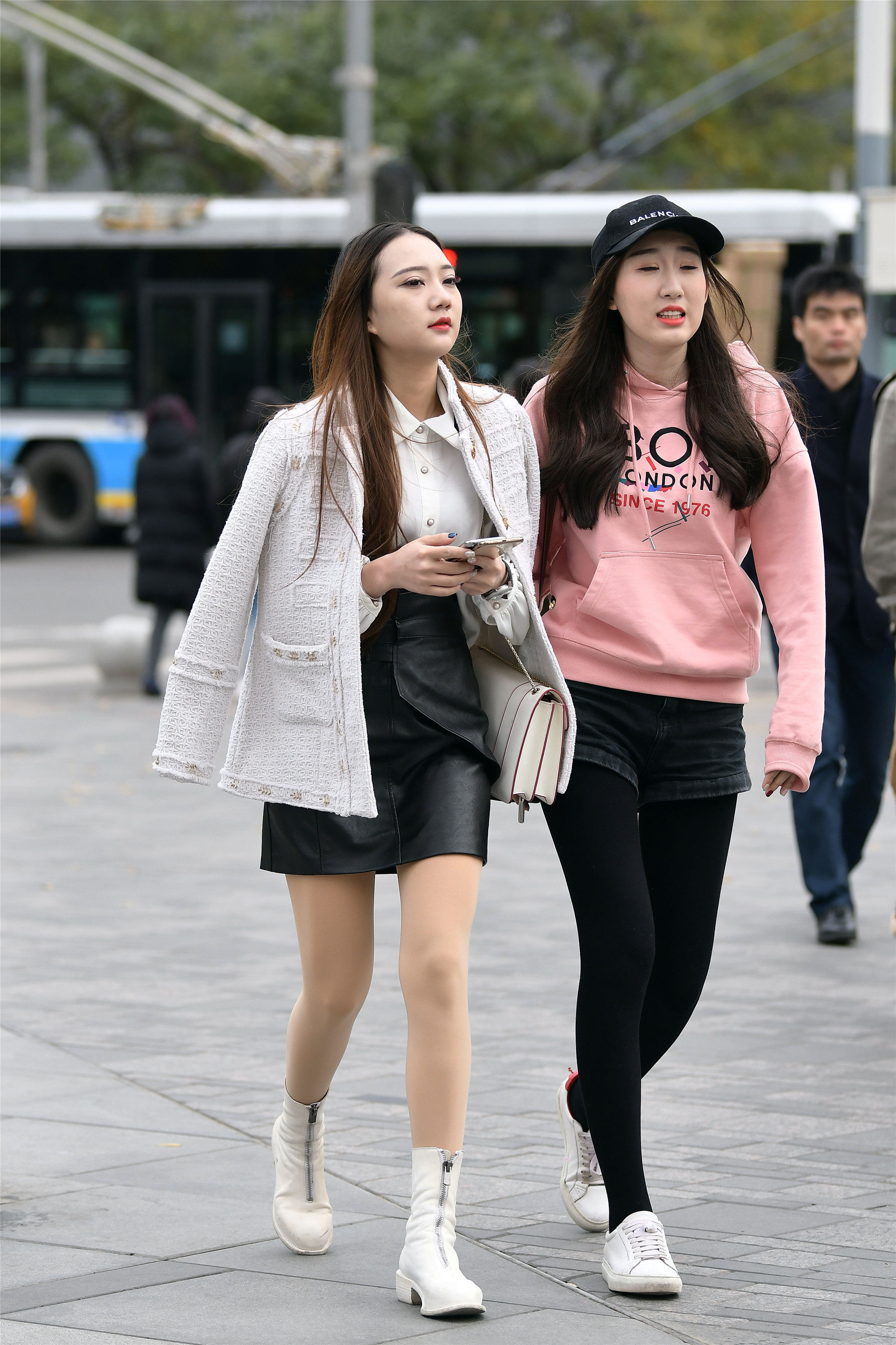 当然也可以和闺蜜搭配出一点色彩味道,白色提花休闲装,厚实感觉十足,被姑娘披在身上,一件黑色皮裙更显身材一些,她的闺蜜搭配浅粉色卫衣,搭配黑色牛仔短裤和打底裤,这样减龄的效果很不错。