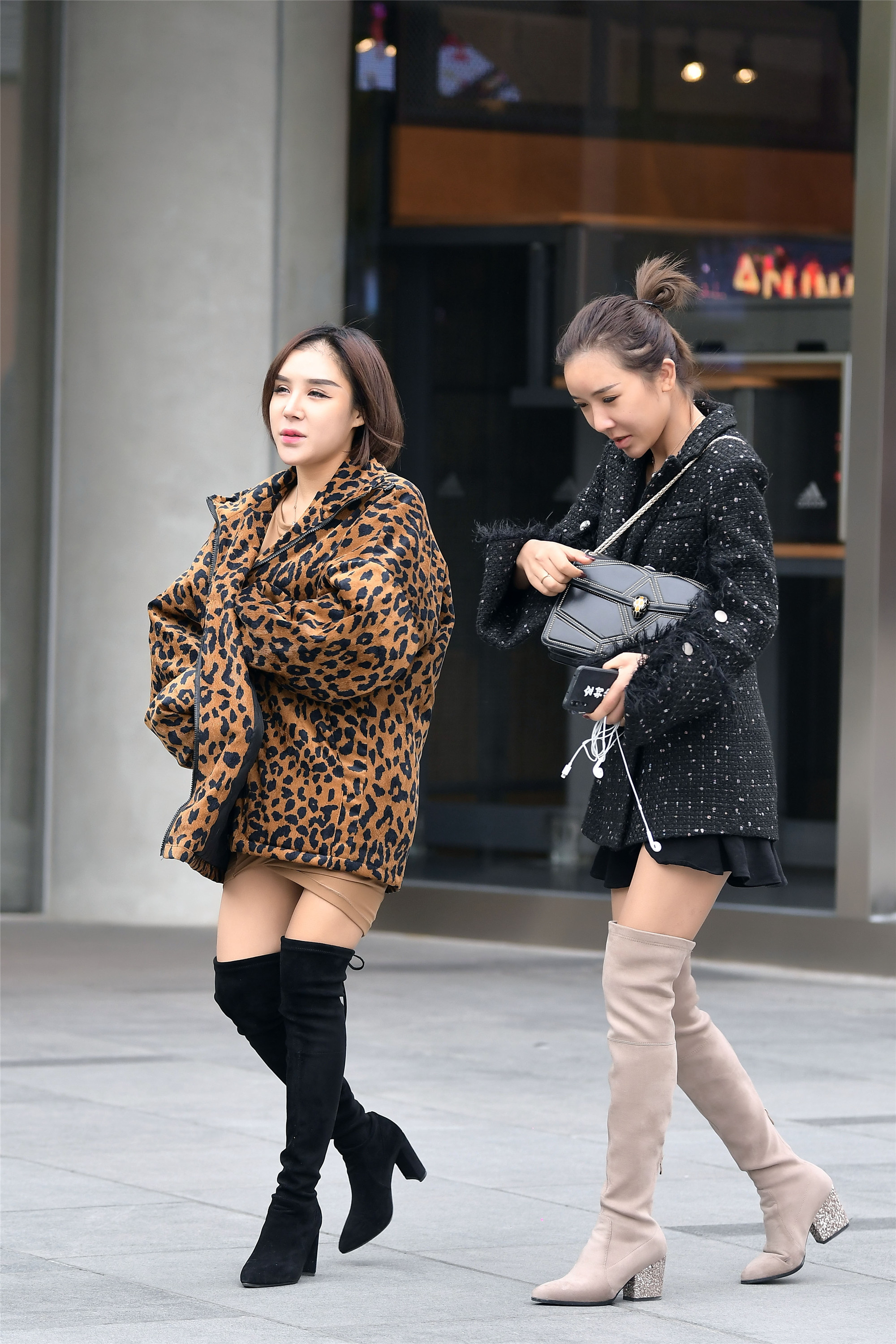 过膝靴,也是和闺蜜逛街经典的搭配,两位姐姐都穿着过膝靴,一位是黑色粗跟过膝靴搭配豹纹大衣,秀出一点包身裙的边缘,一位是灰色搭配一件高档粗织花呢外套,可以看到荷叶边裙摆,与闺蜜形成两种风格穿搭。