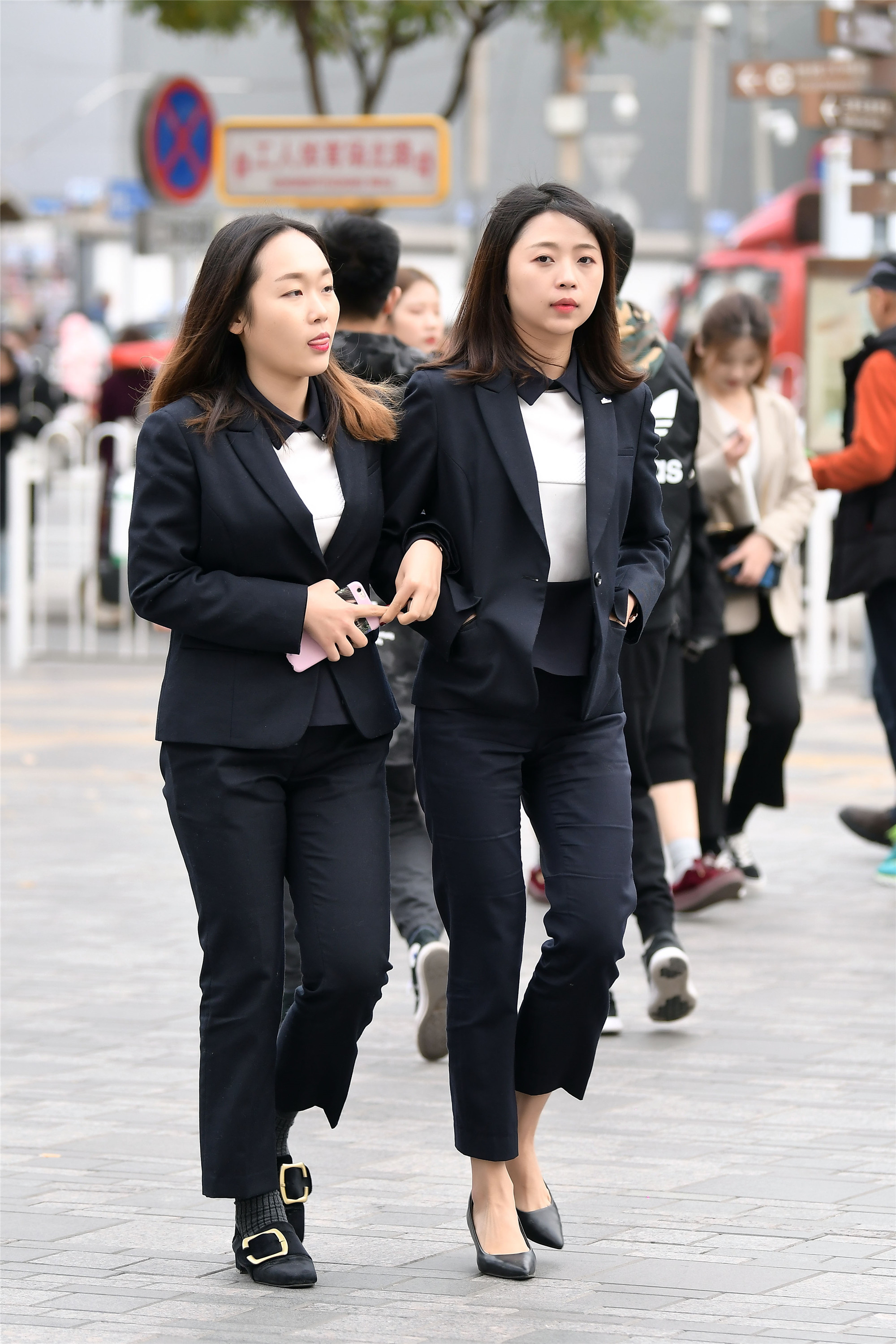 两位姐姐是在附近工作的,所以穿着工作装就过来逛街了,穿着简单,却又透着大气范,深蓝色小西装和九分的西裤,白衬衣作为内搭,她们用两款不同的鞋子来搭配,一位是金属扣的平底鞋,搭配一双厚实棉袜,一位是一双尖头细高跟,都是很不错的搭配。