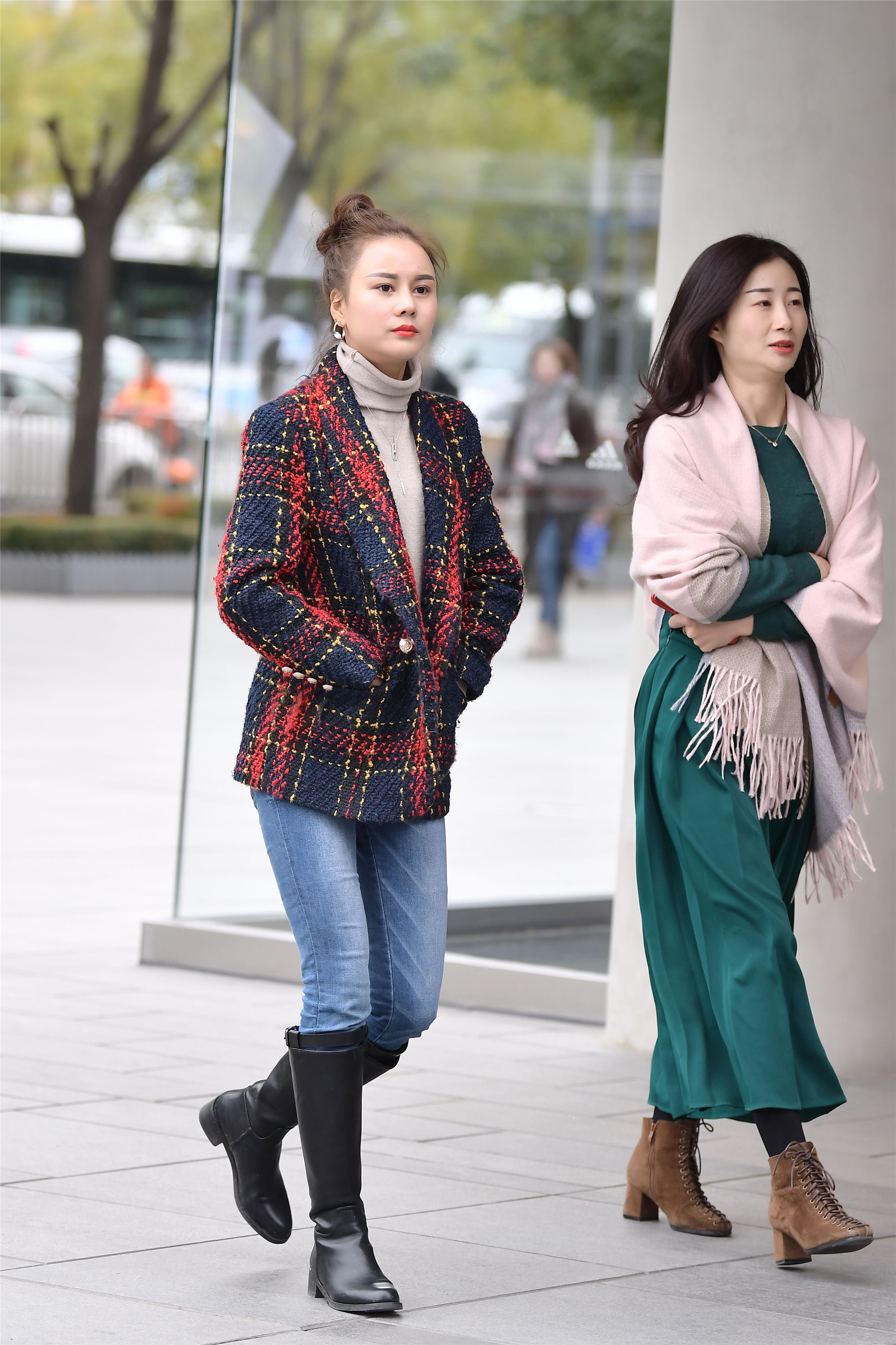 这种粗织花呢面料,今年很流行,而且有很多色彩,做出来的服装也很有质地感觉,显得很高级,也很百搭的效果,搭配牛仔裤和高筒靴,秋天的风格很明显,她闺蜜一身绿色裙子,一件浅粉色的围巾,当做配饰,更显层次和色调的对比。