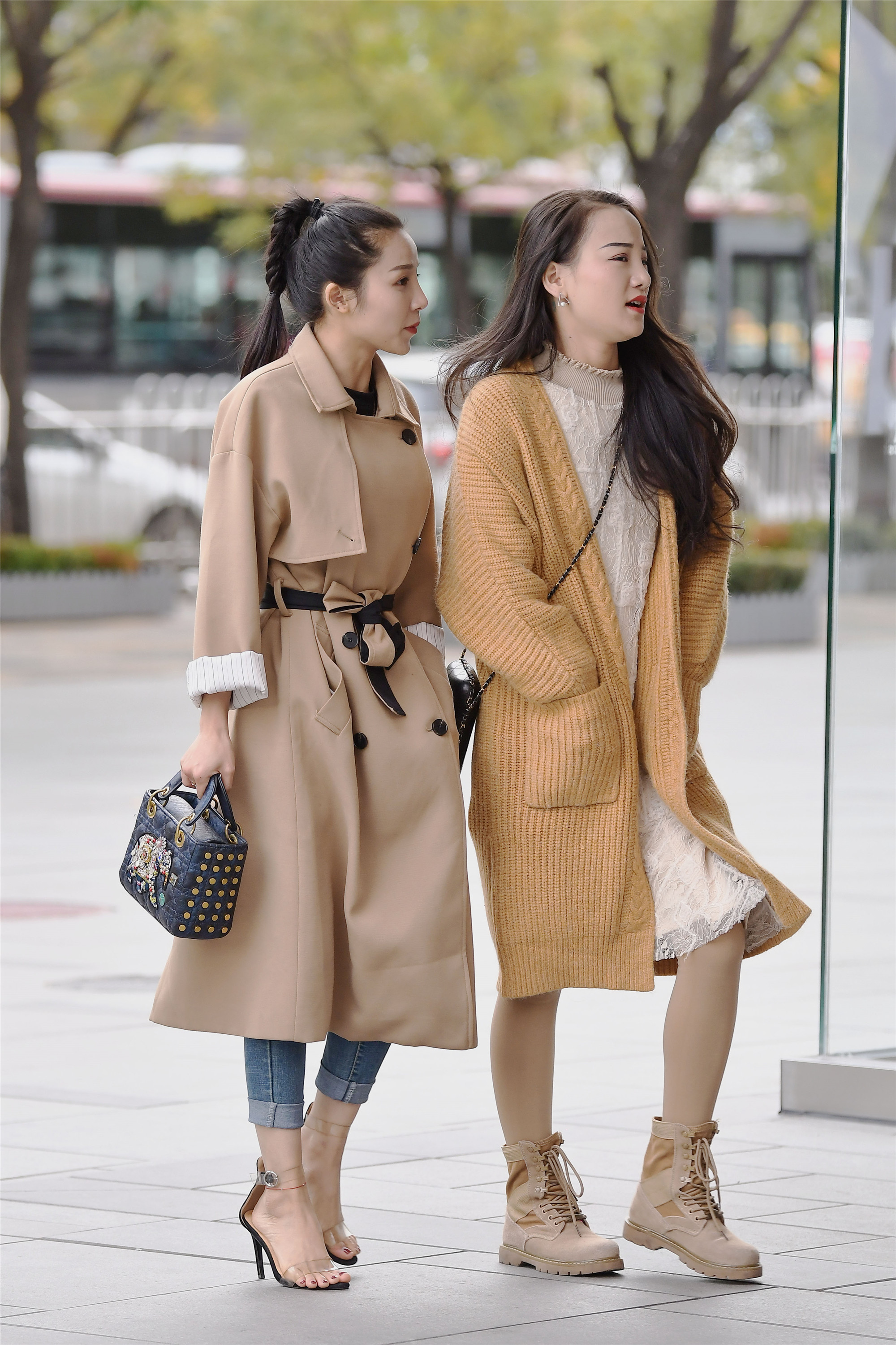 两位姐姐中长版的风衣,不同的材质和色调,不同的搭配,展现了不一样的个性来,一位是米色风衣,姑娘把扣子系上,腰间的腰带系一个蝴蝶结,这样更显身段,牛仔裤裤脚被挽起,一字带的小跟凉鞋更好展现出来,她的闺蜜是一件黄色针织风衣,和米色镂空提花针织裙,一双高帮的平底鞋,暖色调十足。