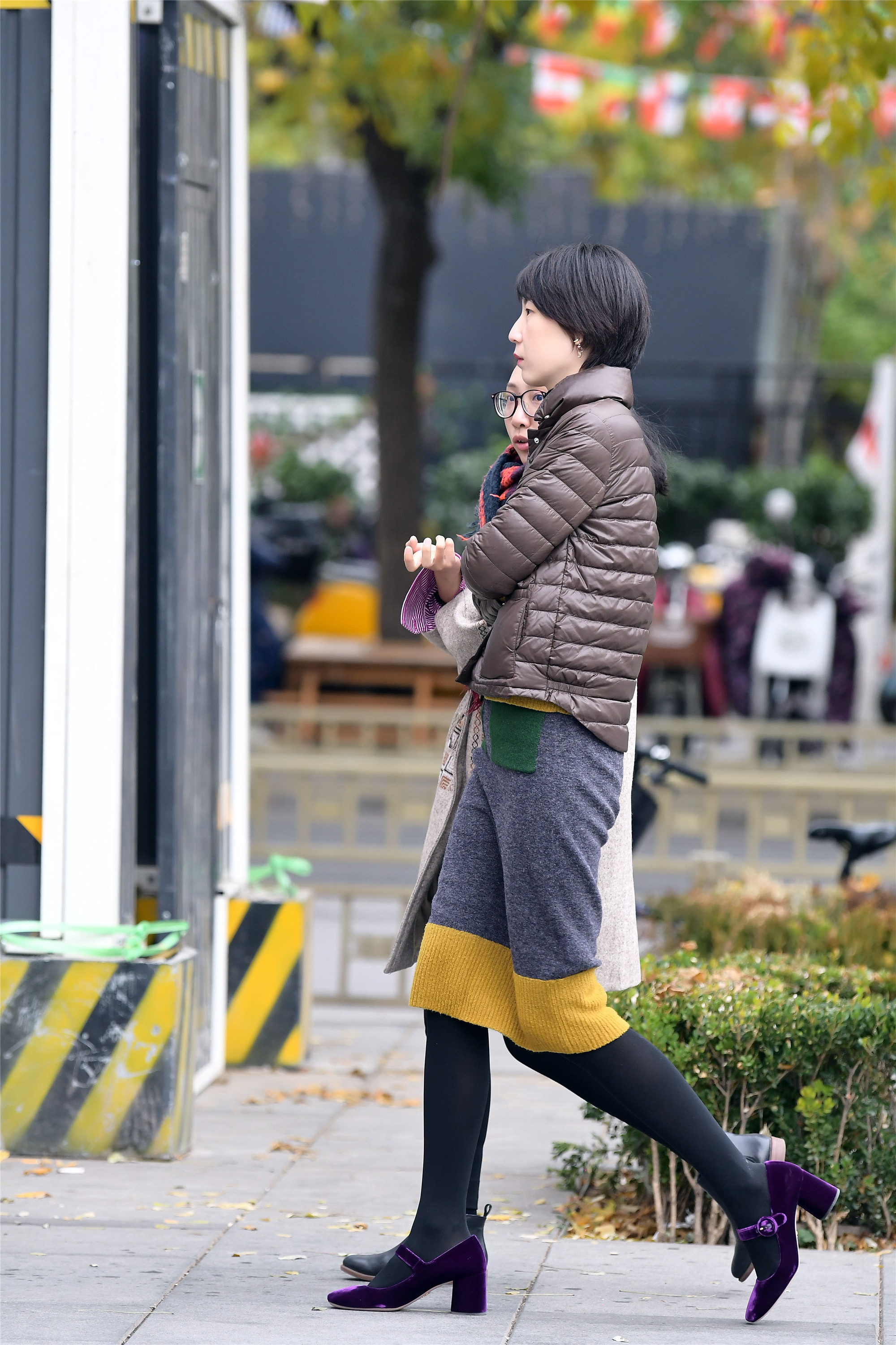 短款的羽绒服可以搭配出更多的层次感来,深棕色羽绒服搭配拼接色长裙,一下段黄色点缀在麻灰色长裙的下摆,黑色打底裤下一双紫色绒面高跟鞋,层次感和色彩搭配非常新潮。