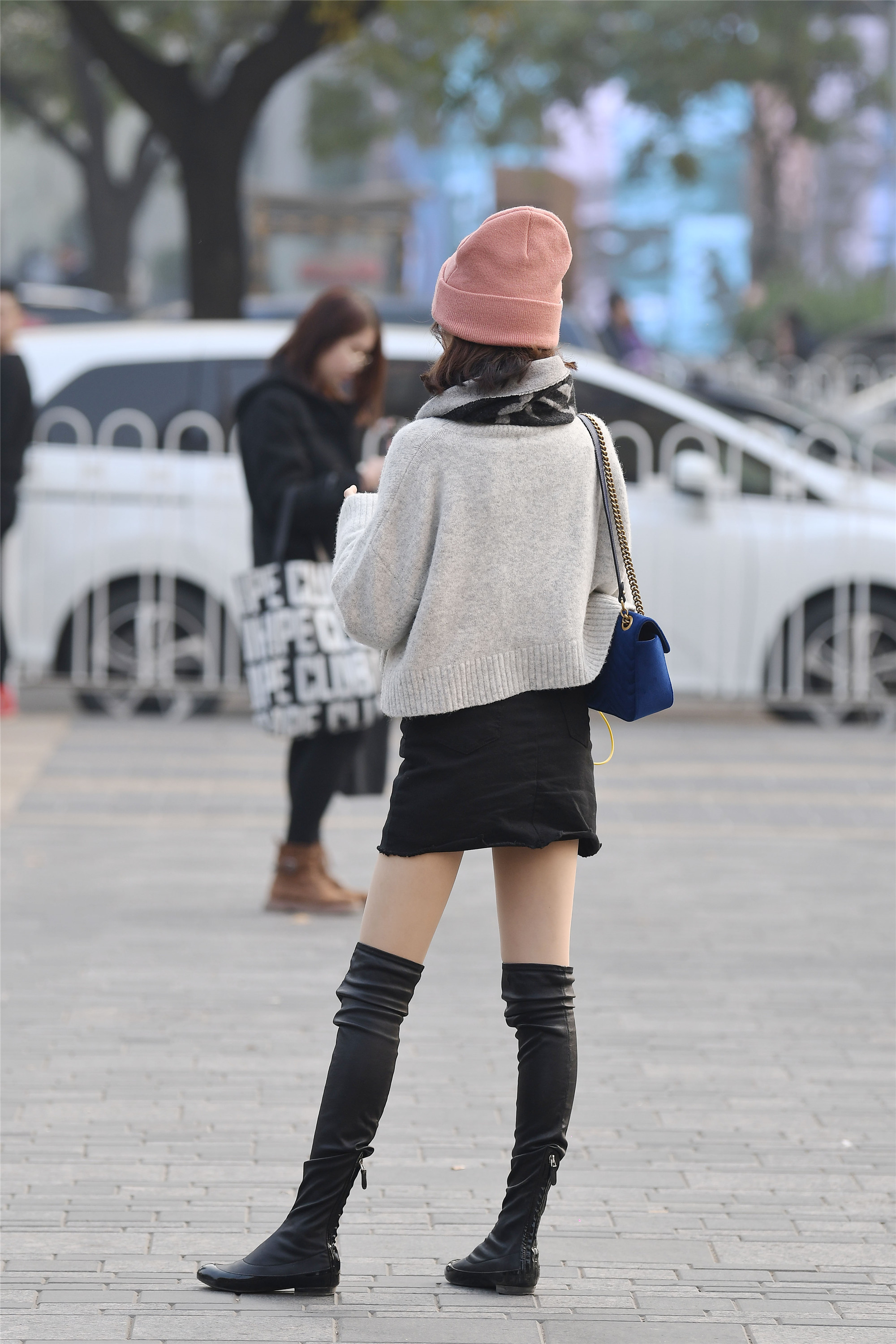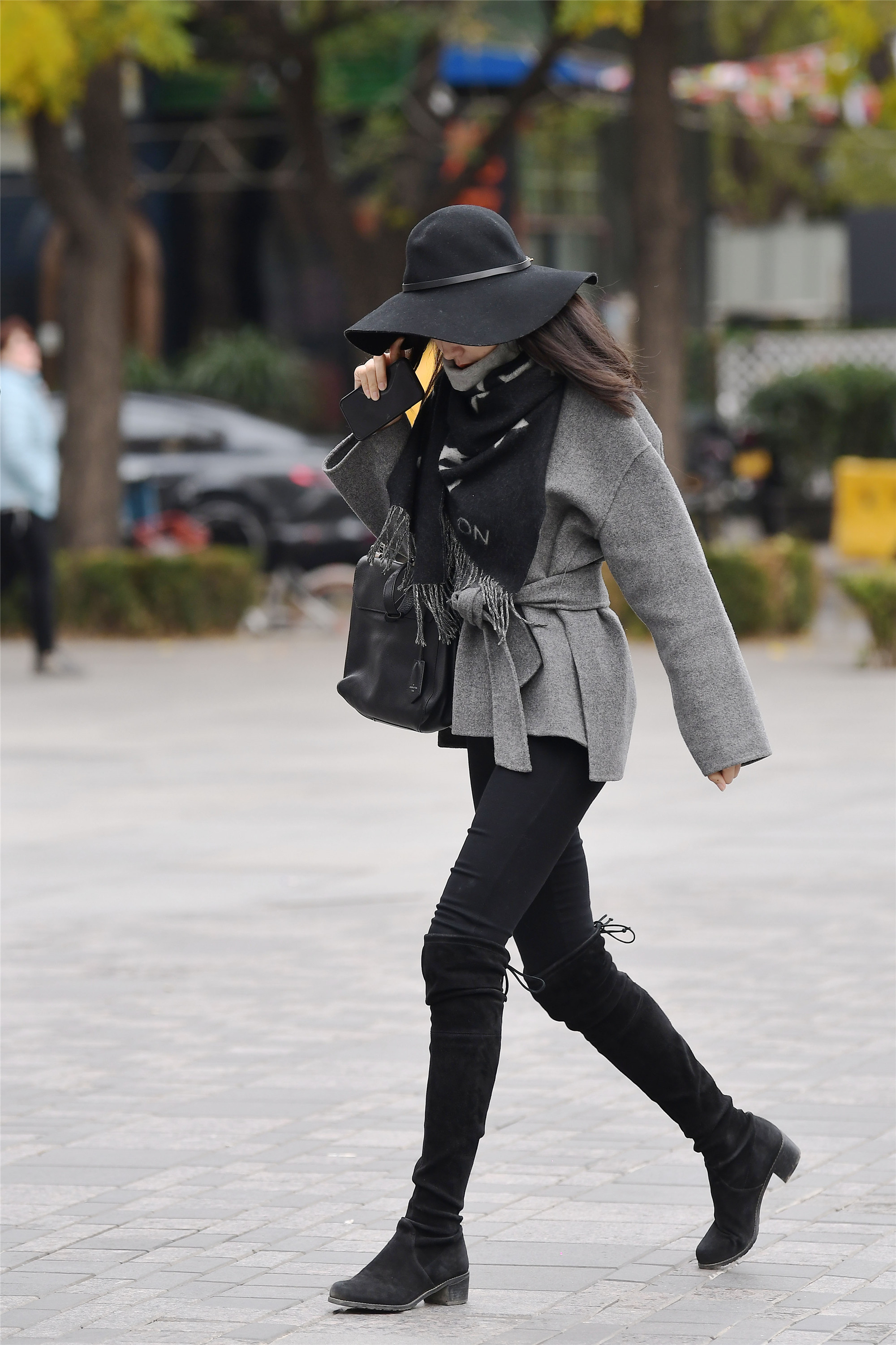 说过膝靴搭配短裙之后会让腿部分节,会显得大腿很粗,很多姑娘却喜欢这样搭配,而身材苗条,又搭配出很好比例的姑娘,也没有感觉到大腿很粗的效果,如果是大腿真的很粗,那么就不要这样穿过膝靴,这位小姐姐黑色皮质平底过膝靴搭配一条黑色裙子,灰色小针织外套更显身材高挑,比例也凸显。